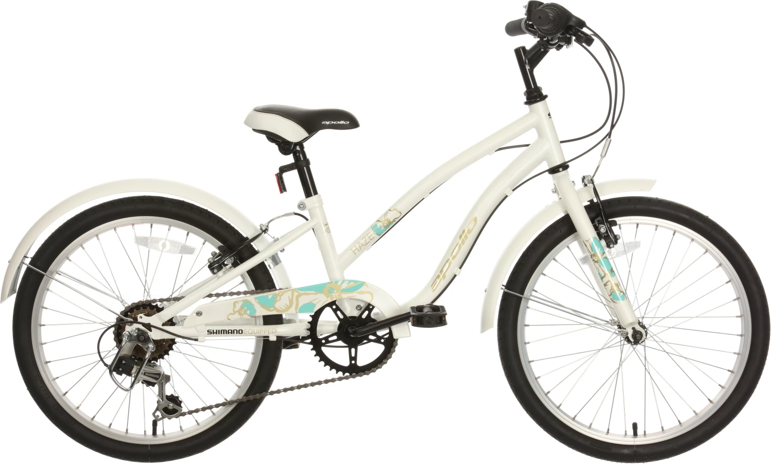 Shimano 6-speed gears and Shimano Revoshift gear shifters make the Apollo Haze a breeze to ride and will have your child sailing up and down hills with ease. Reliable alloy V-brakes provide strong breaking power at their fingertips, while a chainguard and full mudguards will help to keep them clean during their adventures.
