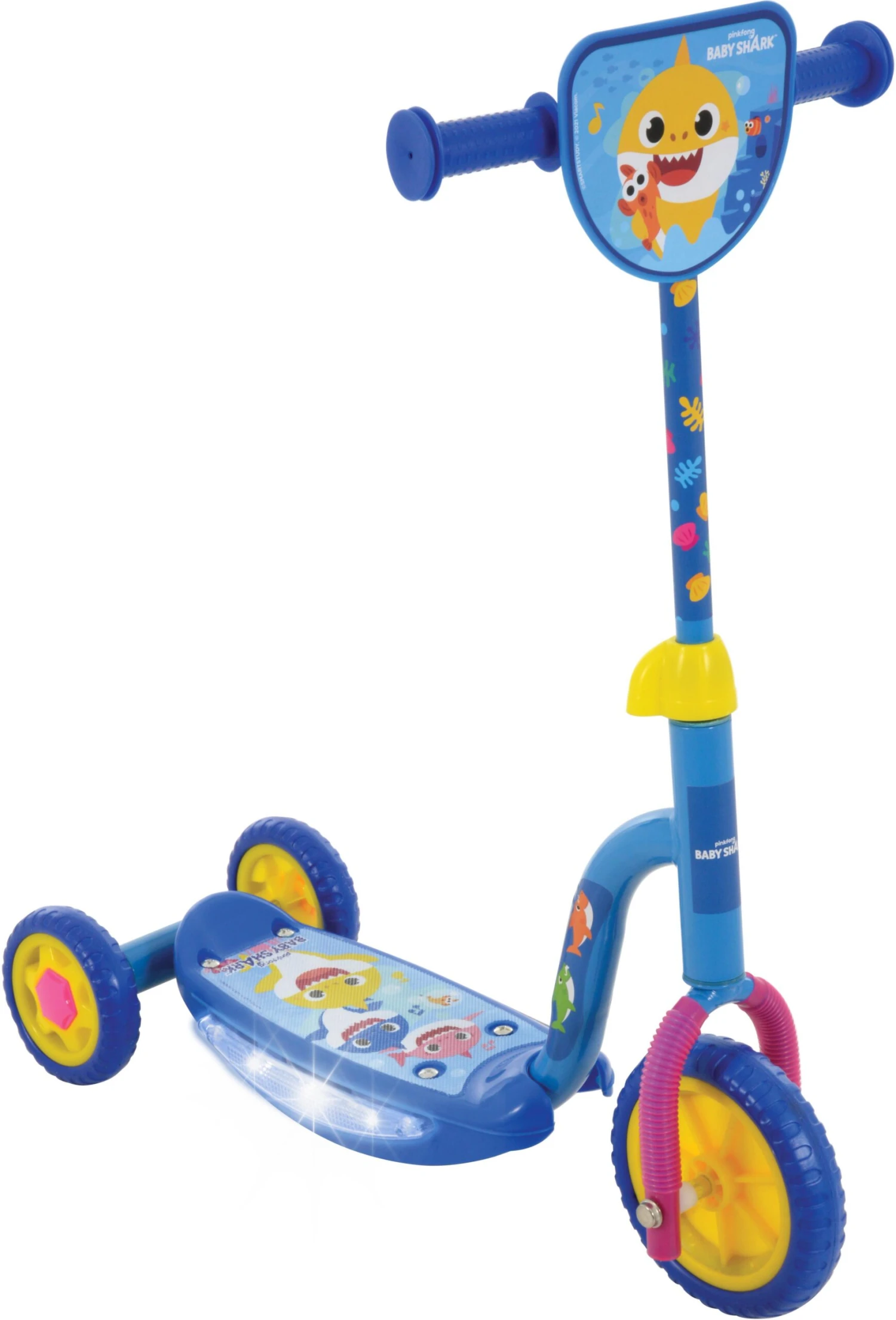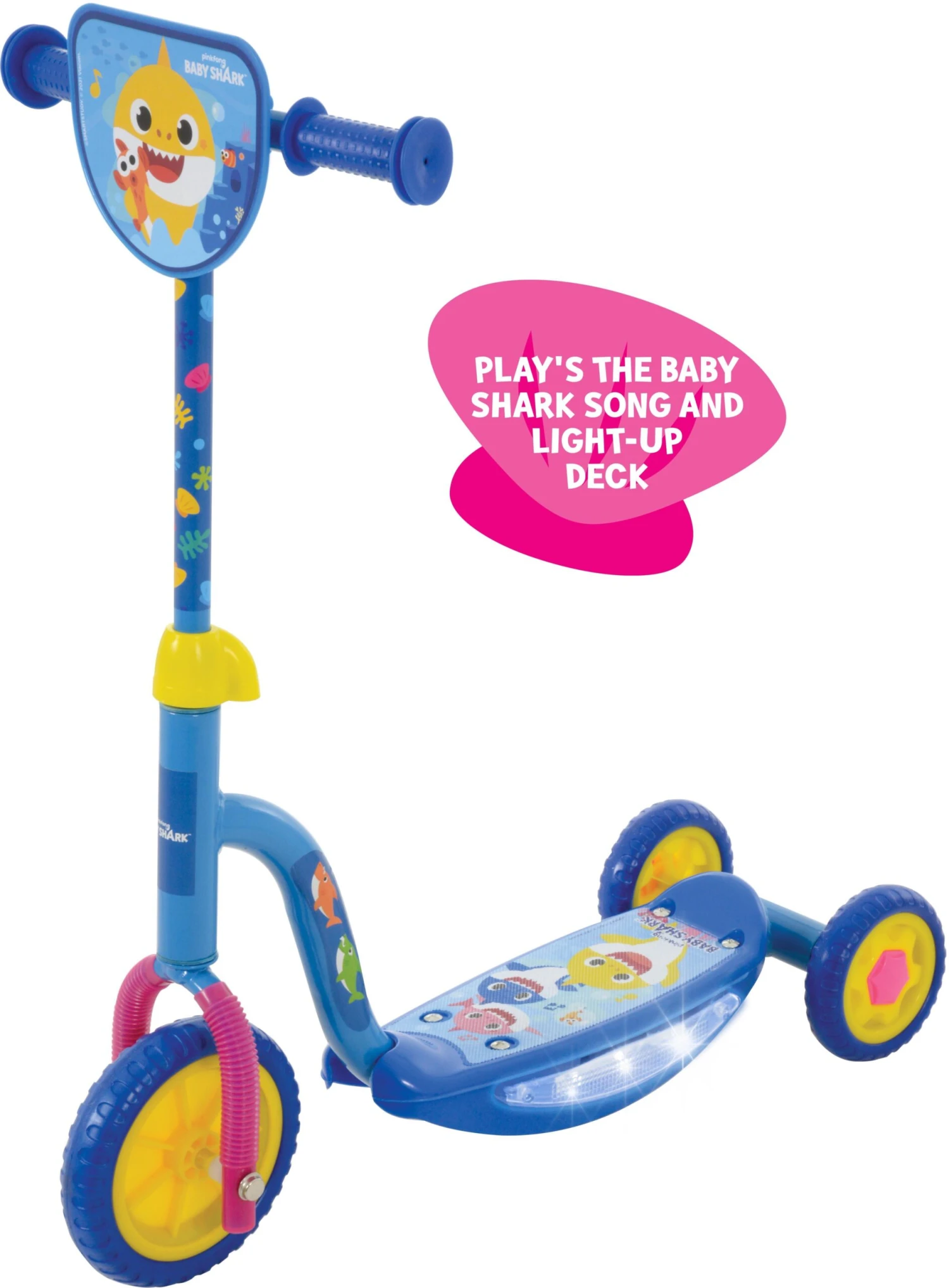 Let's scoot and sing with Baby Shark Lights and sounds tri-scooter. Simply press the switch on the scooter and it willl play the famous Baby Shark song with intergrated flashing LED side deck lights, this is the ultimate scooter!