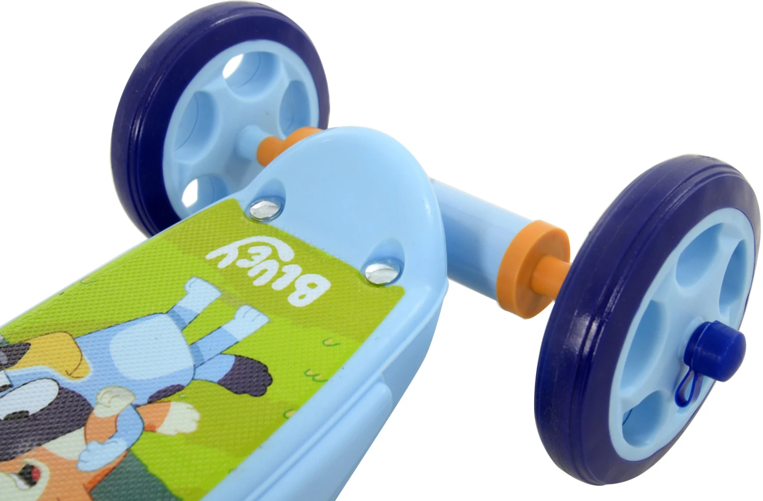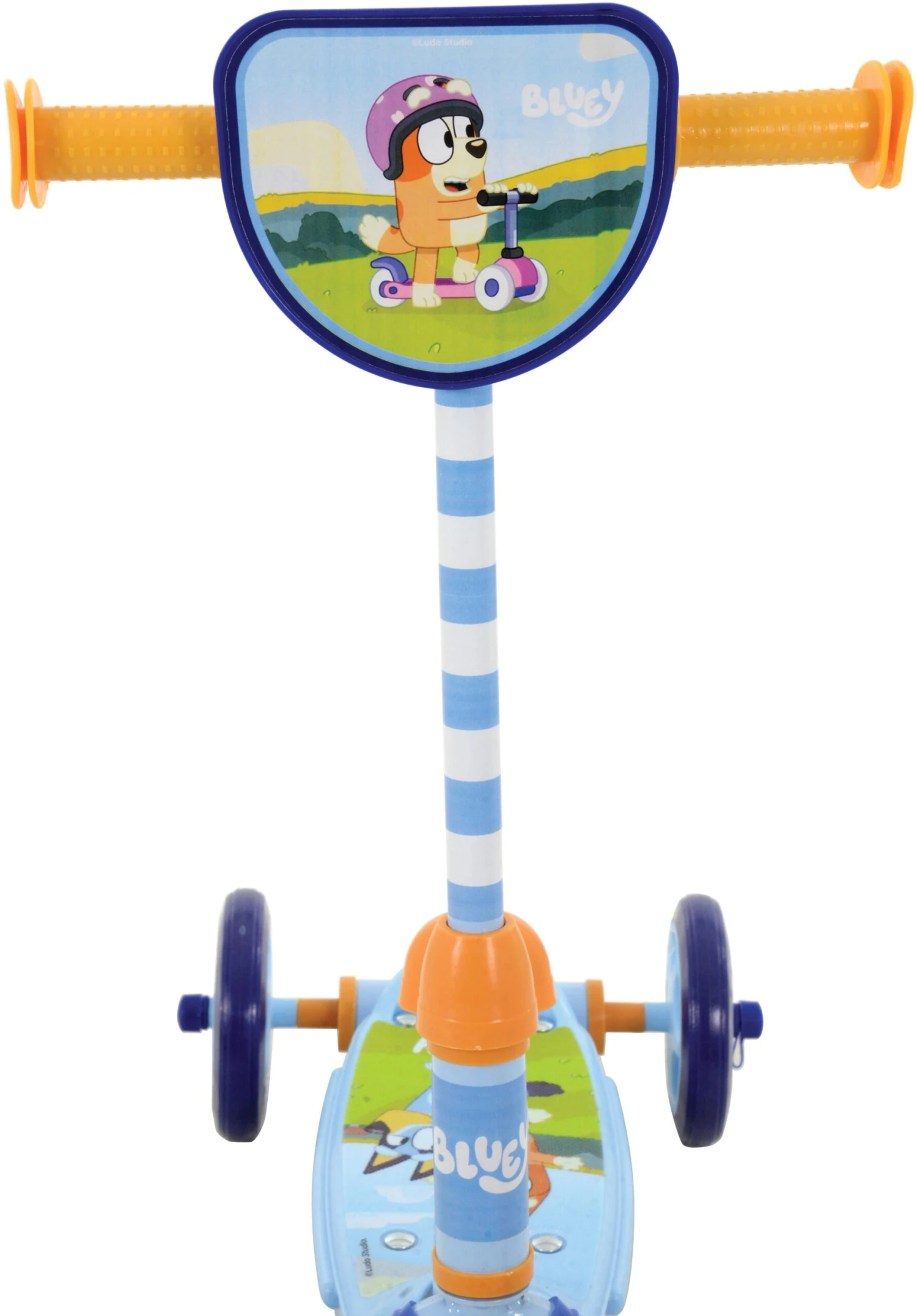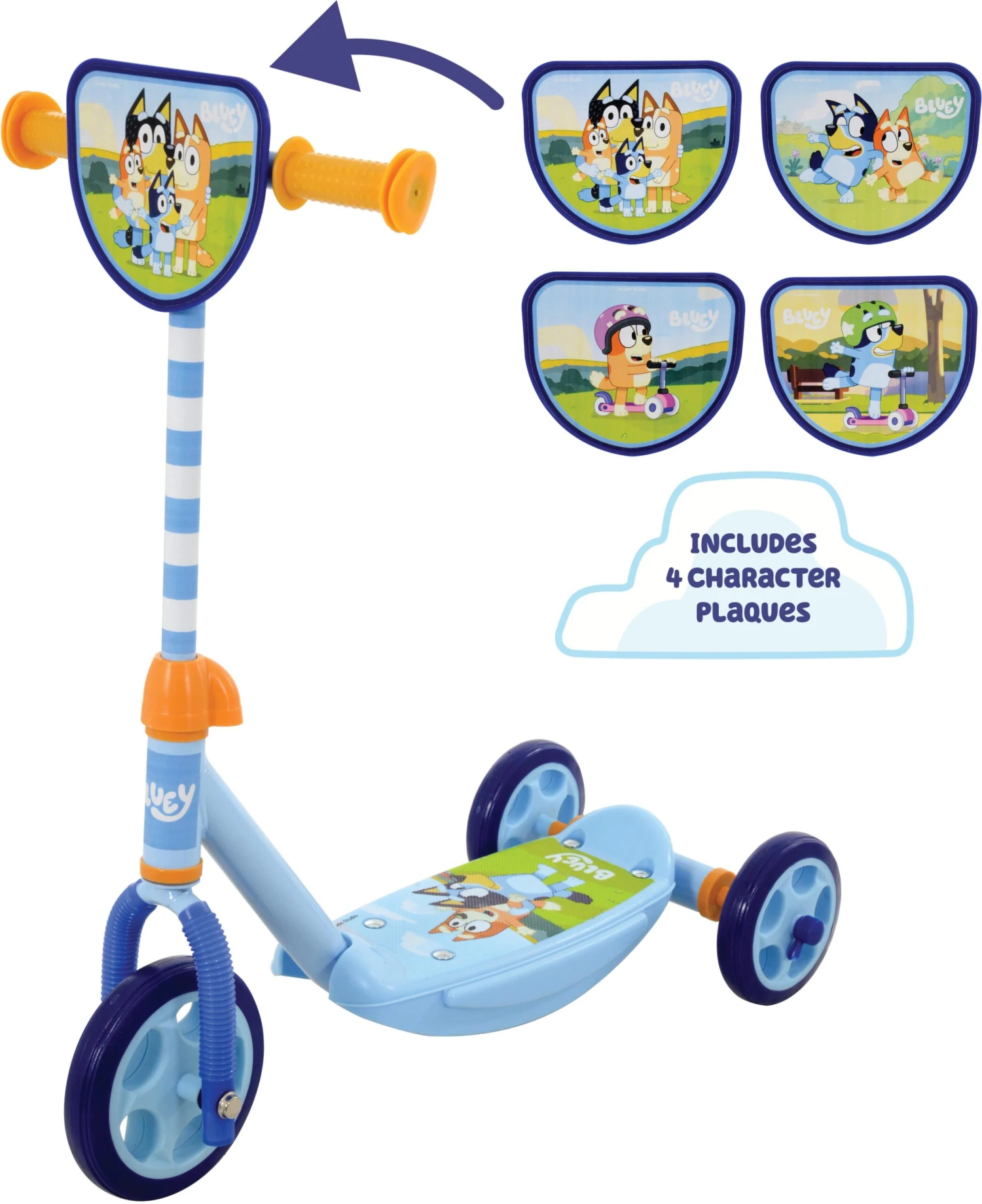 An ideal first scooter for any little Bluey fan, the Deluxe Tri-scooter boasts an array of features. The fully printed anti-slip foot plate not only ensures safety but features cool iconic graphics and has smooth sides to prevent knocks to ankles. All Switch-it products with 4 character plaques which are easily interchangeable for a different adventure every day!