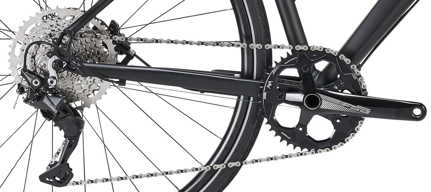 The HYB 8.8 features Shimano’s new M4100 Deore 1×10 drivetrain. This set-up includes an 11-46T cassette which offers a range of gearing that can overcome even the steepest hill. Mountain bike derived technology such as a clutch mech and narrow-wide chain ring ensures the chain always stays on, regardless of how bumpy the ride gets. With only one gear at the front this system is not only lighter but also easier to operate and maintain than more traditional drivetrains.