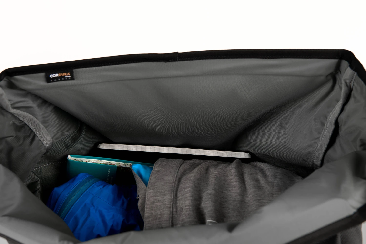 Bags of room. The largest bag in the range, a classic roll top, with multiple storage compartments ready for serious commutes and multiday trips. This highly water resistant bag features an adjustable external load carry strap (making for easy access to helmets or jackets), integrated water bottle sleeve and padded laptop section. Made with a tough textured Cordura fabric and stretch mesh for the expandable side pockets, this bag packs-it-all in, day in, day out.