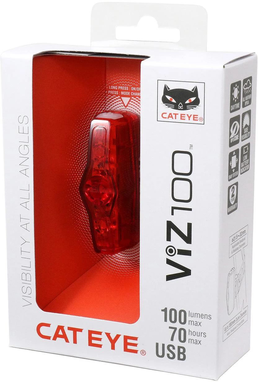 Compact, bright, and versatile, the all new Cateye VIZ 100 Lumen Rear Bike Light stands out with great visibility from the OptiCube™ lens technology and Daytime Hyperflash™ mode in an economical package. A fully featured rear light, the ViZ100 (Which replaces the previous best selling Rapid Mini), comes with 4 settings including a group ride mode and flashing mode which gives an impressive 70 hours of runtime.