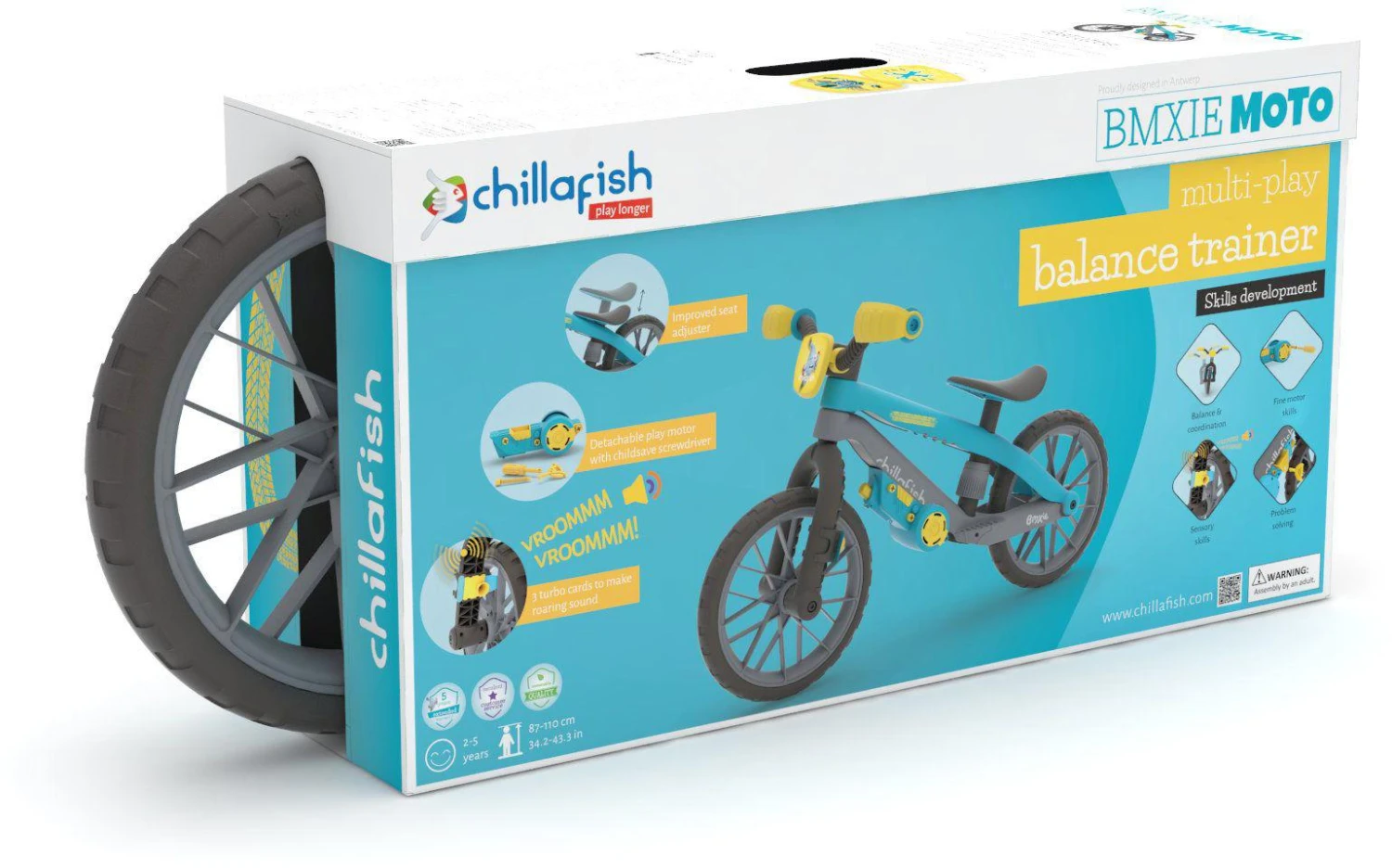 The Chillafish BMXie Moto Balance Bike gets kids excited while learning multiple skills. BMXie Moto is a multi-play balance trainer and now comes with detachable play motor & sound ‘turbo cards’. Learning balance on a balance bike gets even better: insert the Turbo Cards to make real motor sounds while riding, VROOM VROOM or unassemble your play motor to fix your bike in the pits. The play motor has 2 small storage areas closed off with the child safe screws & screwdriver included in the packaging.
