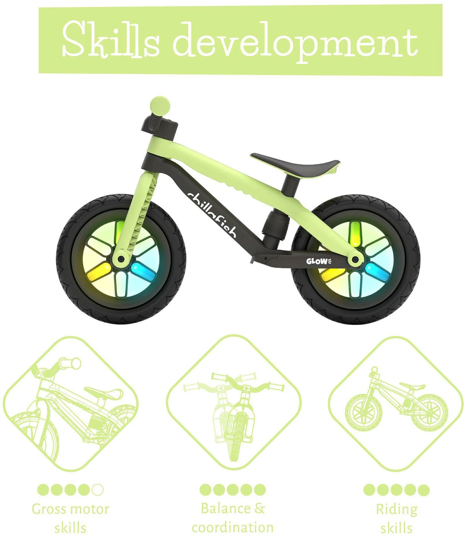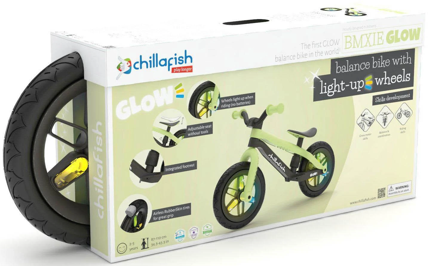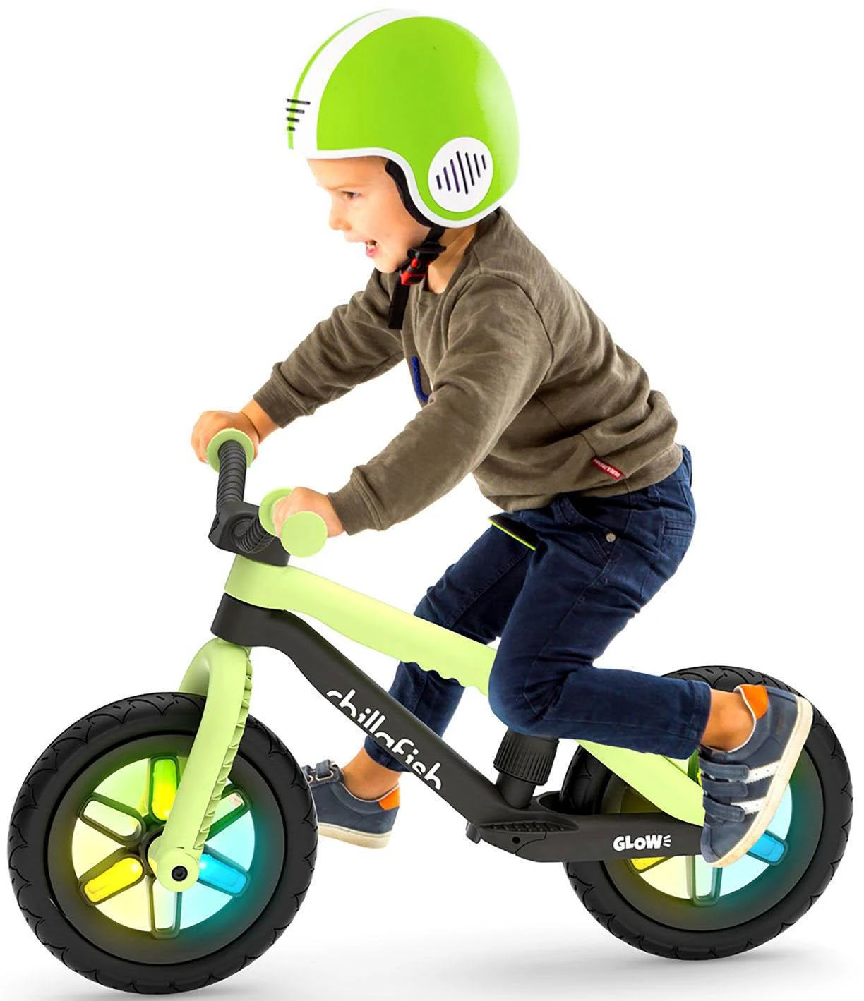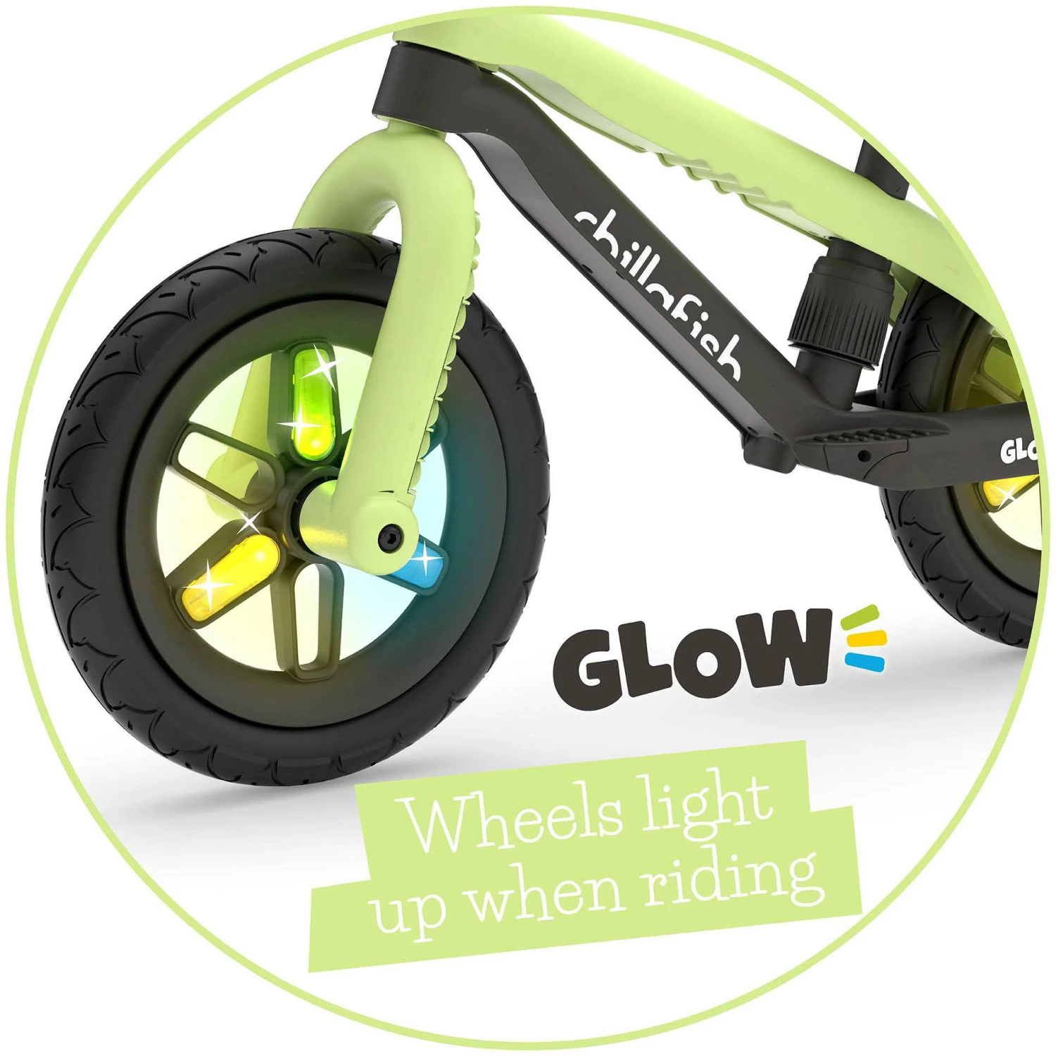 Chillafish BMXie Glow is the first balance bike with 12 inch integrated light-up wheels when riding for extra fun and visibility. The LED lights in the wheels don't need any batteries, they are simply powered by riding the BMXie Glow. The faster you go, the brighter they glow.