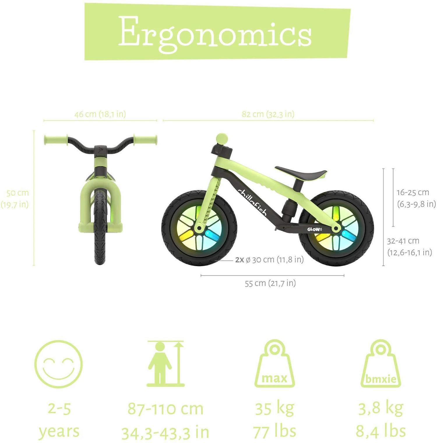 BMXie Glow seat adjusts without tools from 12,6-16,1 inch / 32-41 cm. Is your seat too high or too low? Just turn, pull and lock, simple as that! The light-up wheels are a fun extra for kids and provide extra visibility when riding.