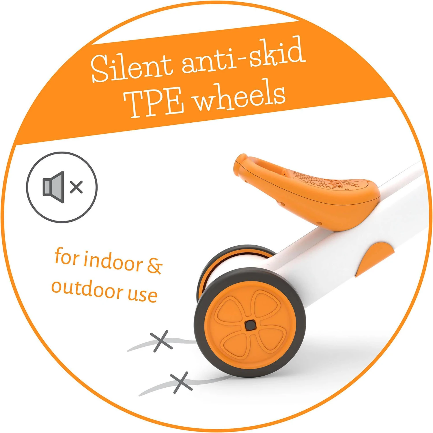 The silent anti-skid synthetic rubber tires are non-marking; so no worries when your toddler wants to ride inside the house. But the material of the tires is also strong enough to be used outside and to survive the wildest outdoor treks.
