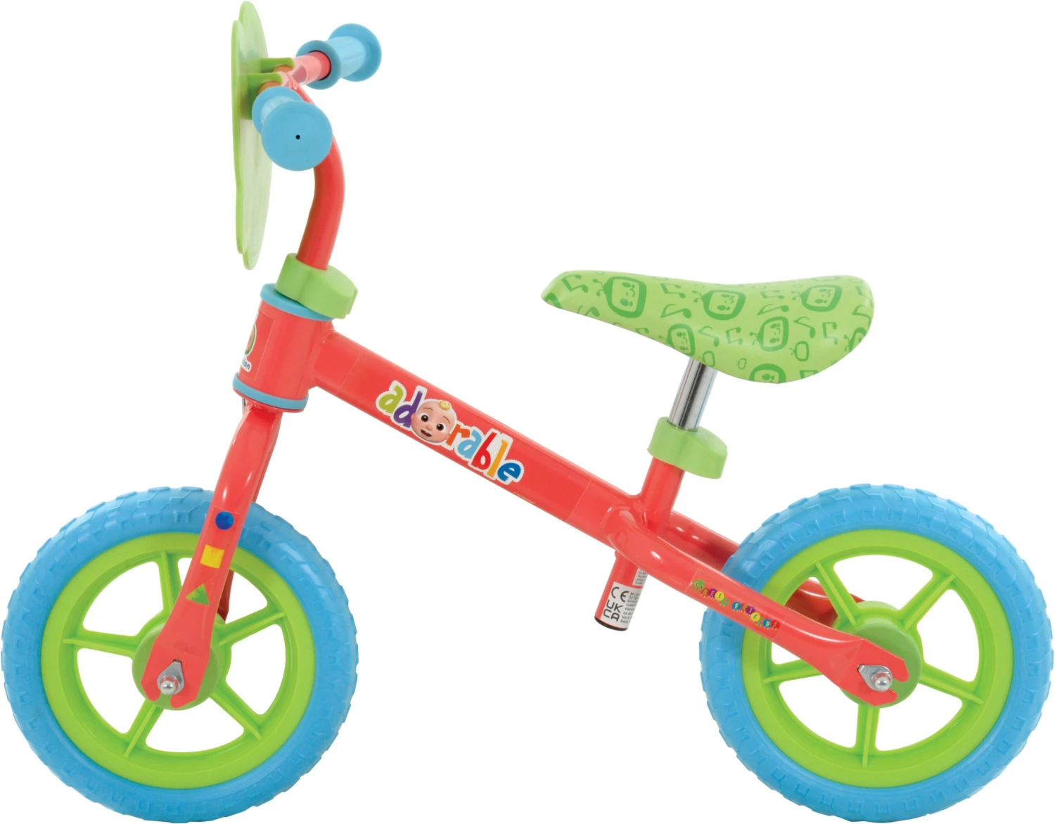 The CoComelon balance bike comes with: 25cm (10″) lightweight wheels, Puncture proof tyres, with deep tread for stability, Adjustable handlebar height and seat height, Soft moulded handlebar grips, character graphics and cool shaped plaque.