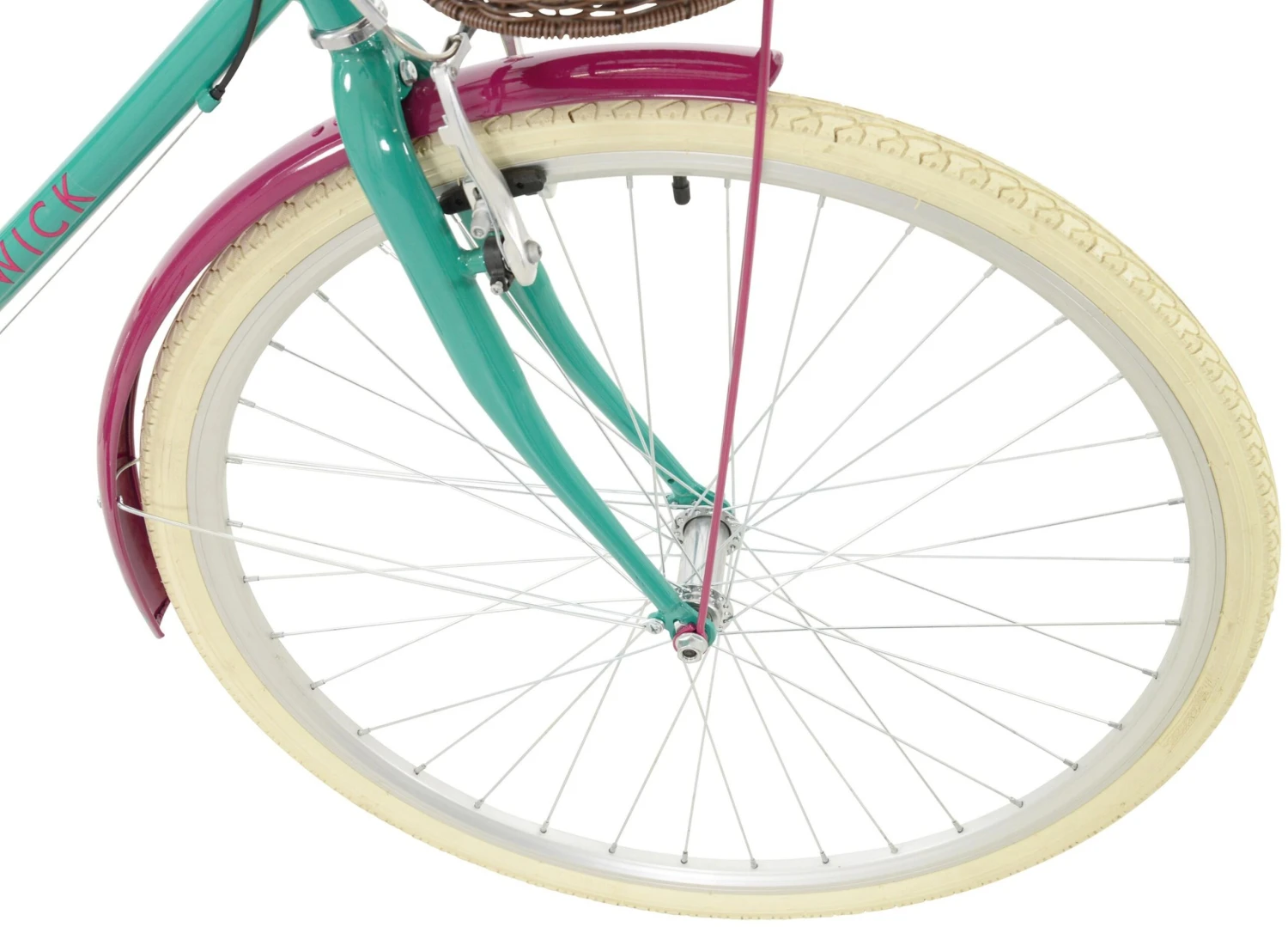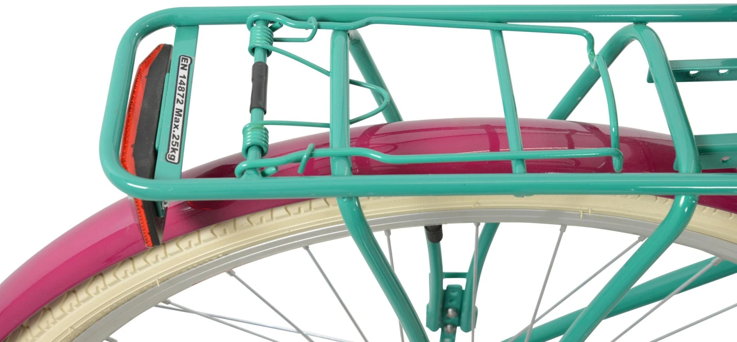 The frame is finished in striking dark green with contrasting fuschia finished front and rear full-length metal mudguards, as well as the matching full length chain guard providing protection from the chain. The 700C smooth-rolling cream coloured tyres complement the satin alloy wheel rims & chrome seat-post,handlebar and stem.