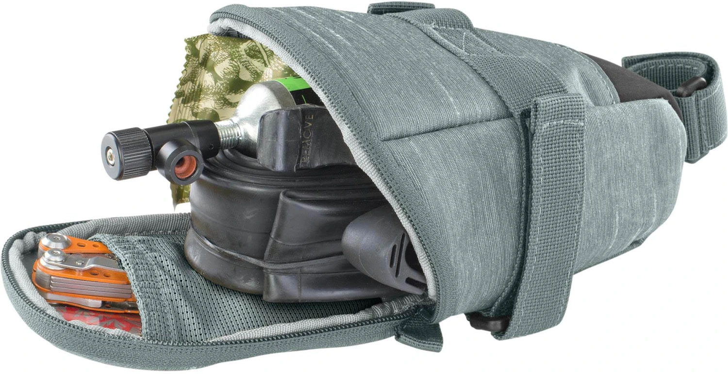 The EVOC Seat Bag Tour is a lightweighted saddlebag made of highly water-repellent material is easily attached to any regular seat post with Velcro fasteners and offers enough space for tools and a spare inner tube.