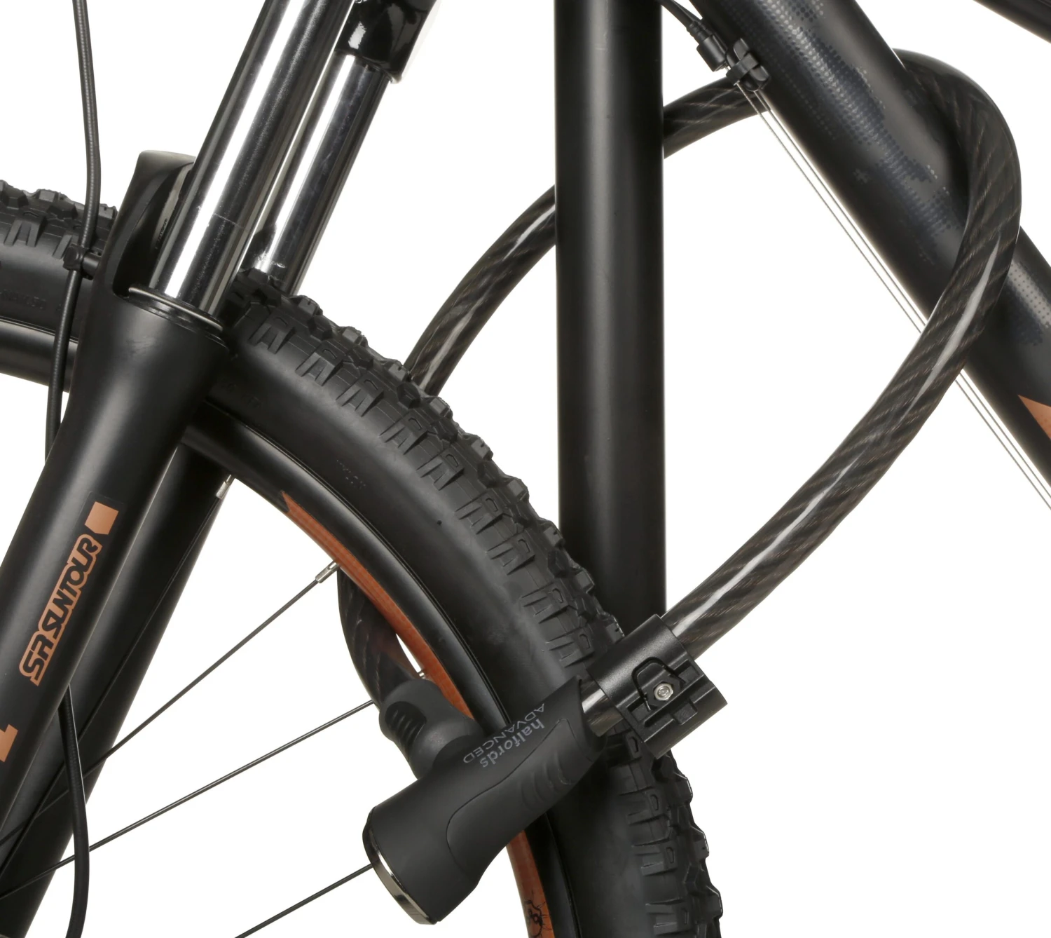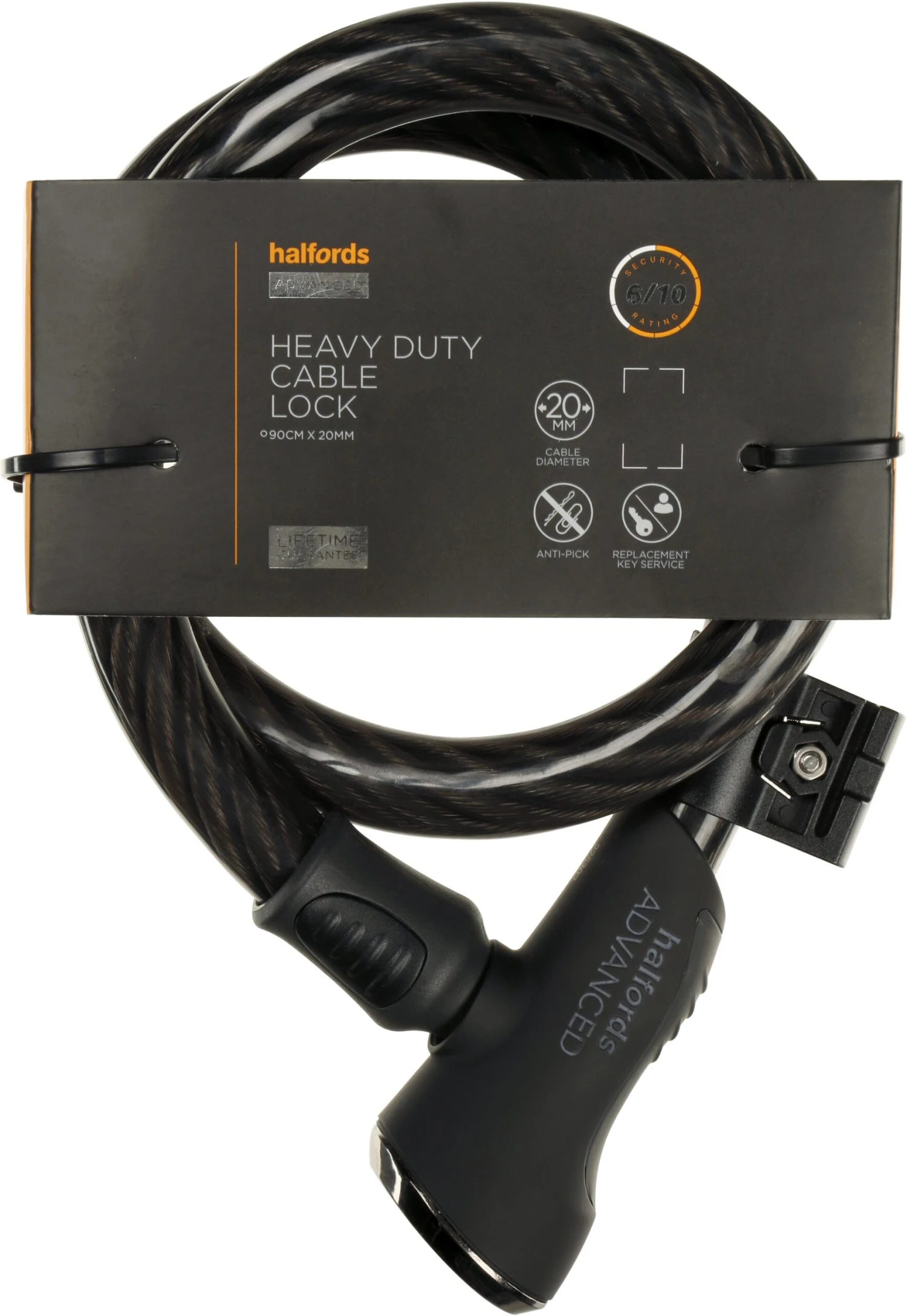 The Halfords Advanced Heavy Duty Cable Lock 90cm – Key offers the convenience of a standard cable lock, but with added security thanks to its 20mm steel core. The locking mechanism also features a double bolt and “”Dump block”” to combst lock picking attacks. Ensure you are securing your bike to a fixed object in a well lit location, making sure that any accessories or quick release wheels are also locked up.