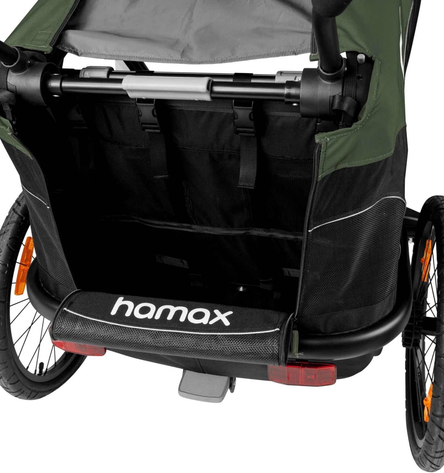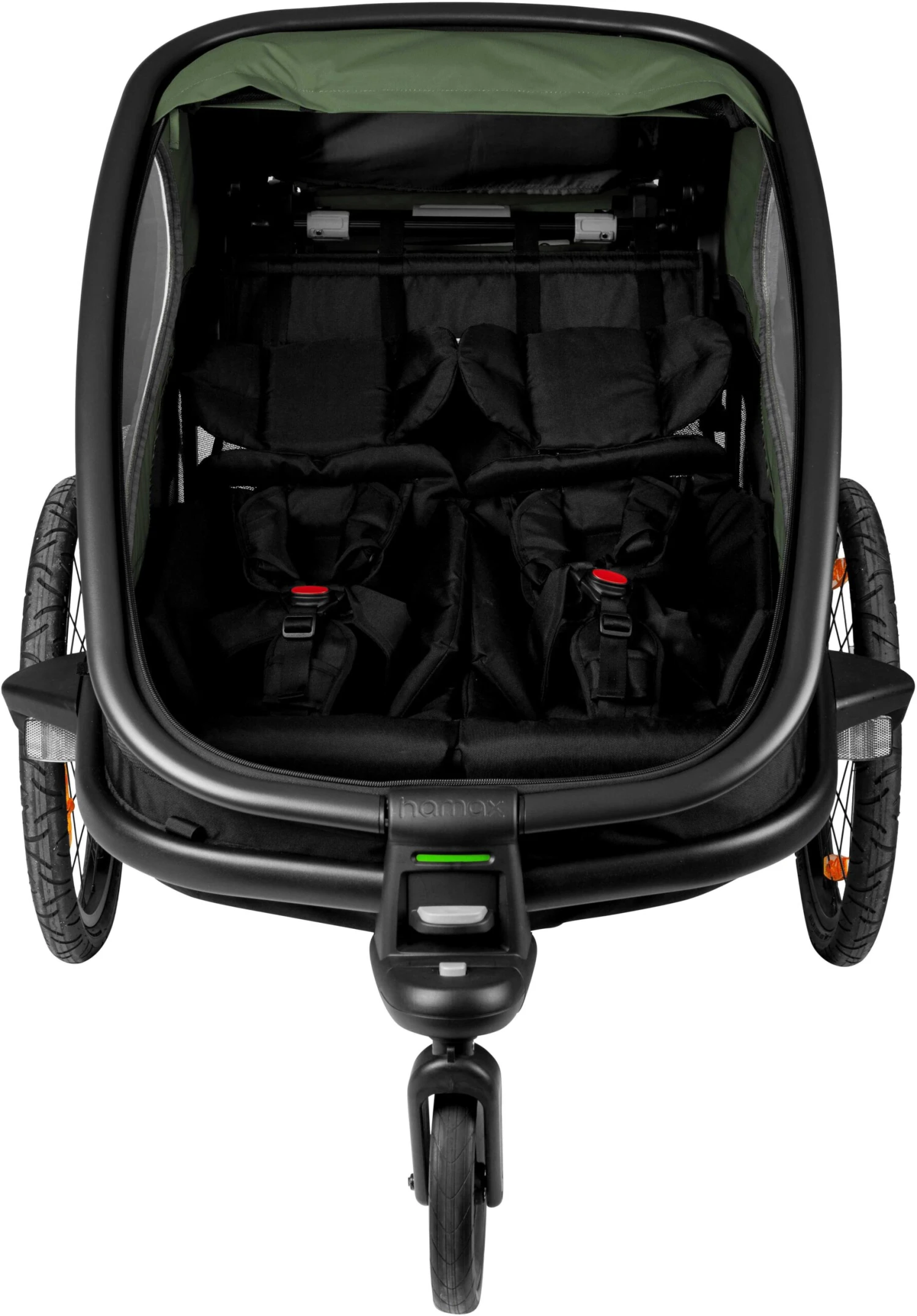 The Hamax Outback is built around a solid aluminium frame to provide optimum protection and generous space for its occupants. The front of the carrier is equipped with the unique “Safe Connection Point” which secures a safe switch between bicycle arm, stroller wheel and optional jogger wheel. The connection point displays a green field when mounted correctly and a red field when unlocked.