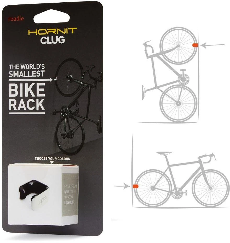 The Clug Roadie fits tyres 23-23mm (1-1.25″) and works with your floor to give you beautiful bike storage (horizontally or vertically). Available in three sizes, the Eurobike award winning clug is the world's smallest bike rack. It mounts in minutes using the screws and Toggler wall plugs provided. All you do is roll your bike up and Clug it in!