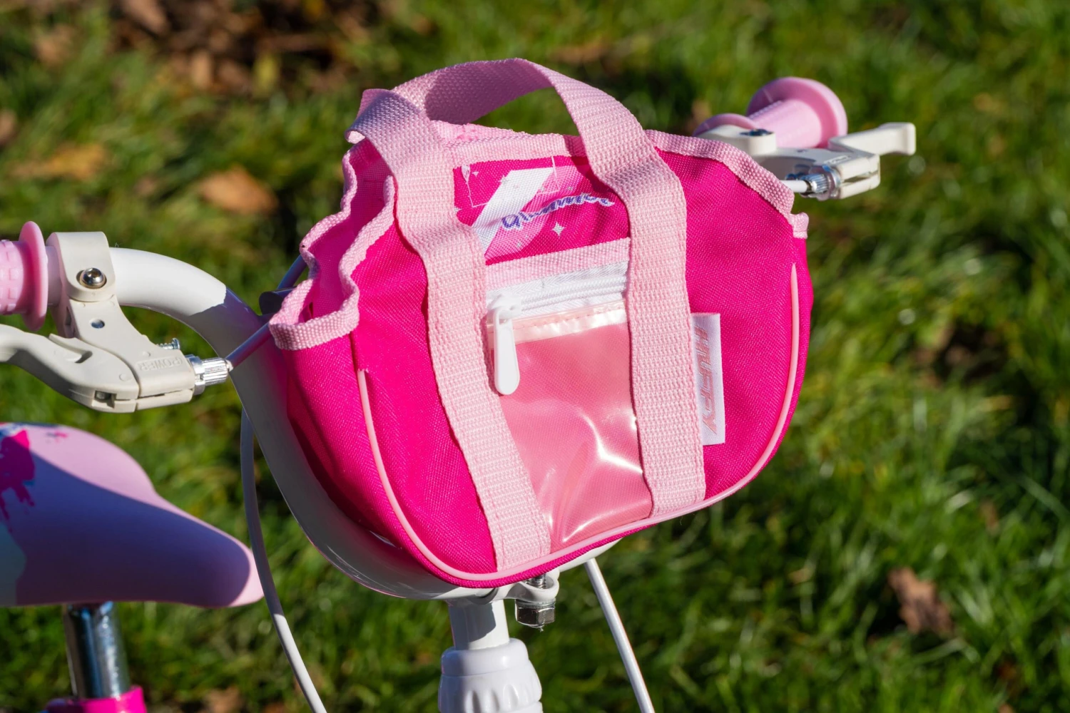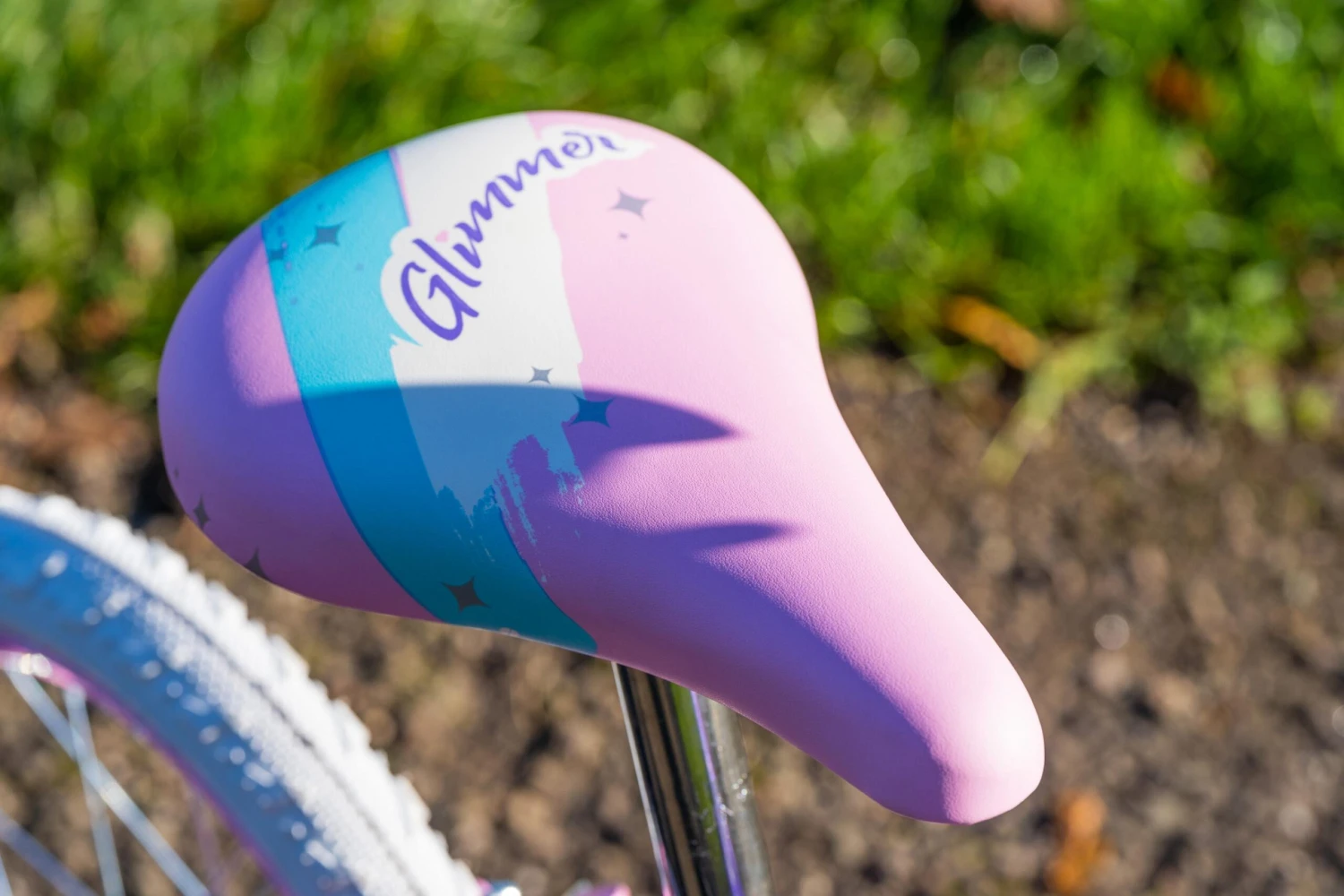 Glimmer Bike Key Features: adjustable saddle and handlebars – adapt as your child grows, front fabric storage pouch – take treasured items along for the ride, colourful graphics – glimmer styling stands out from the crowd, full caliper brakes – for easy and safe stopping, stabilisers included – Ideal for learning, and easy to remove once skills improve.