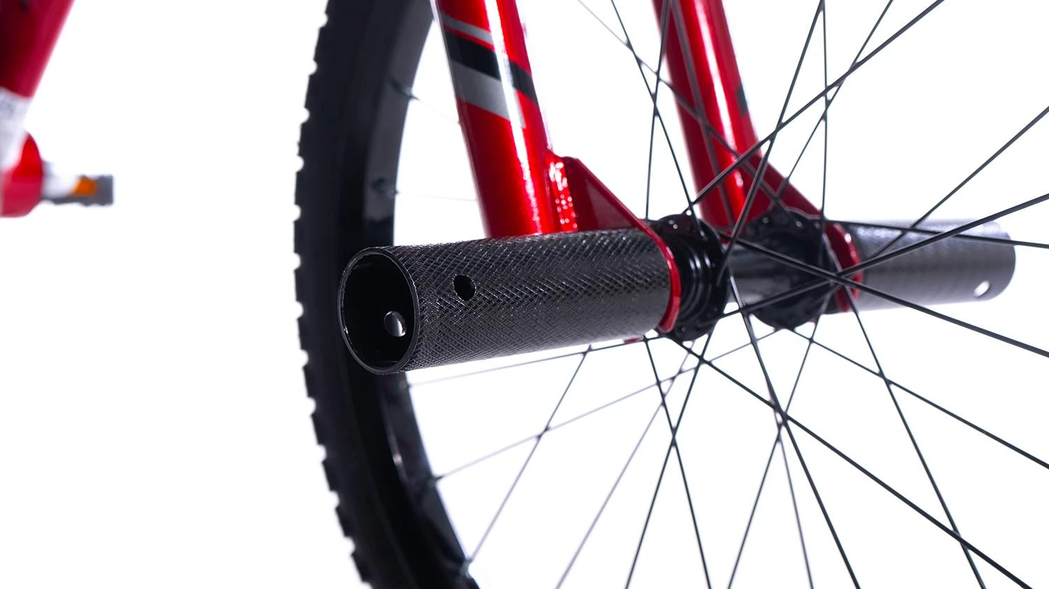 BMX Style: The gloss crimson red frame looks awesome with the black wheel rims and handlebars; smoky gray tire sidewalls; front BMX pegs and kickstand included; rear coaster brake and front linear pull brake
