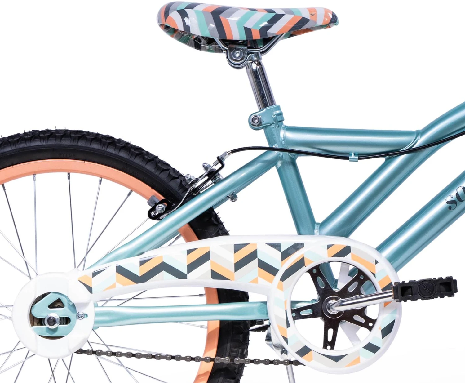 Huffy presents a bike fun to ride with a fun design. The Huffy So Sweet bike is no exception. The sea crystal bike features sweet decorations on the padded seat, chainguard and frame graphics for a coordinated look. Even the front handlebar pad is designed for safety and coordinates the timeless design of the bicycle. The single-speed bike is easy to ride and in perfect style with coral-coloured rims that stand out against the black tyres.