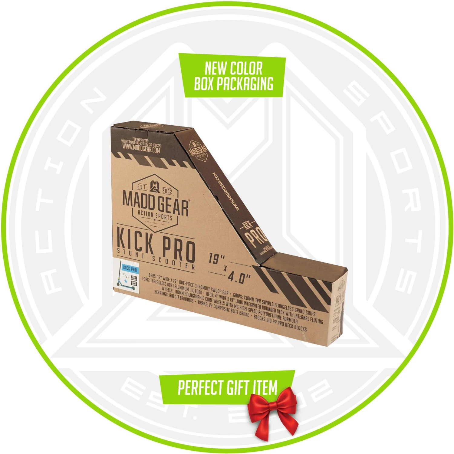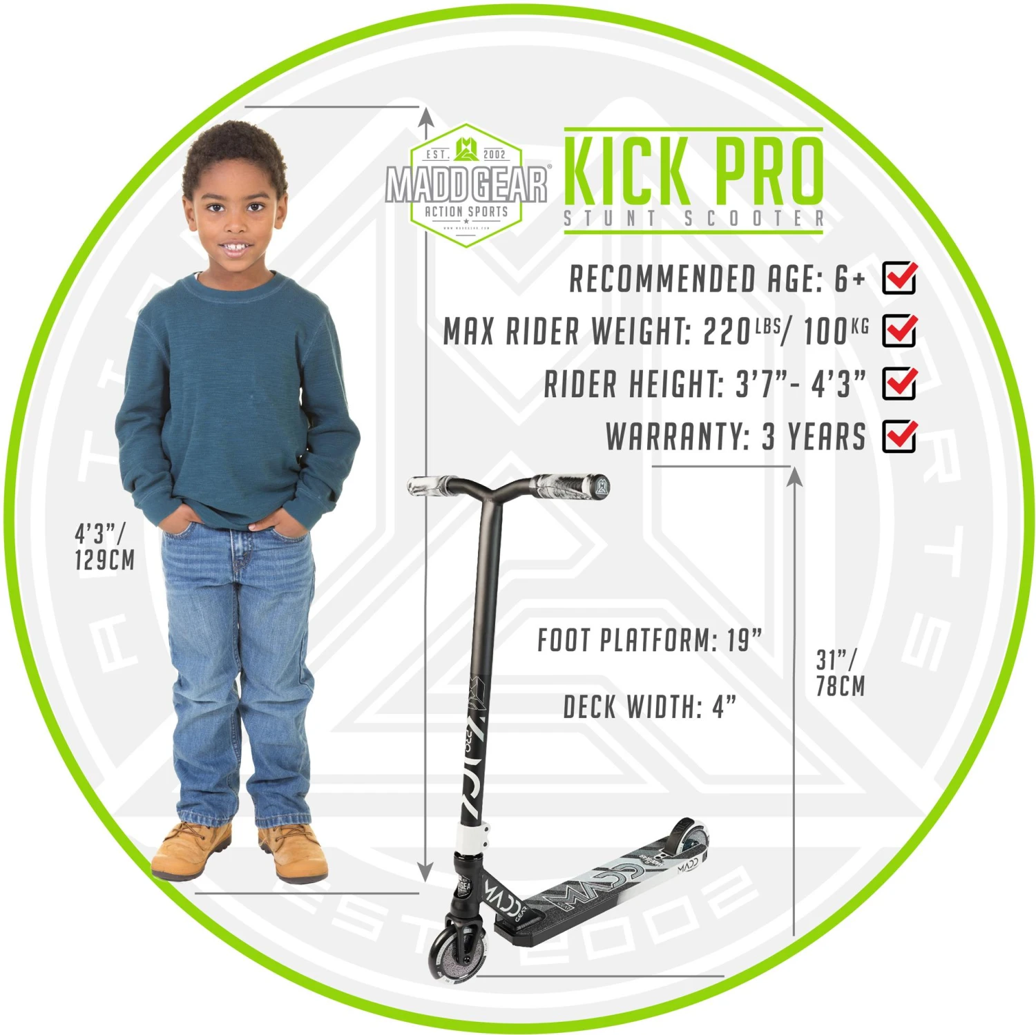 The Madd Gear Kick Pro Stunt Scooter strikes the perfect balance between weight and durability in the ideal size to take any young shredders riding to the next level. Every component of the Madd Gear Kick Pro Scooter was designed to produce the most balanced and smoothest rolling Kick Pro scooter ever! Whether you’re just riding to school or ripping down at your local skatepark, the Madd Gear Kick Pro Stunt Scooter is designed to stand up to the demands of today’s aspiring pro riders. Weighing just 3.05kg / 6.72lbs for the complete scooter.