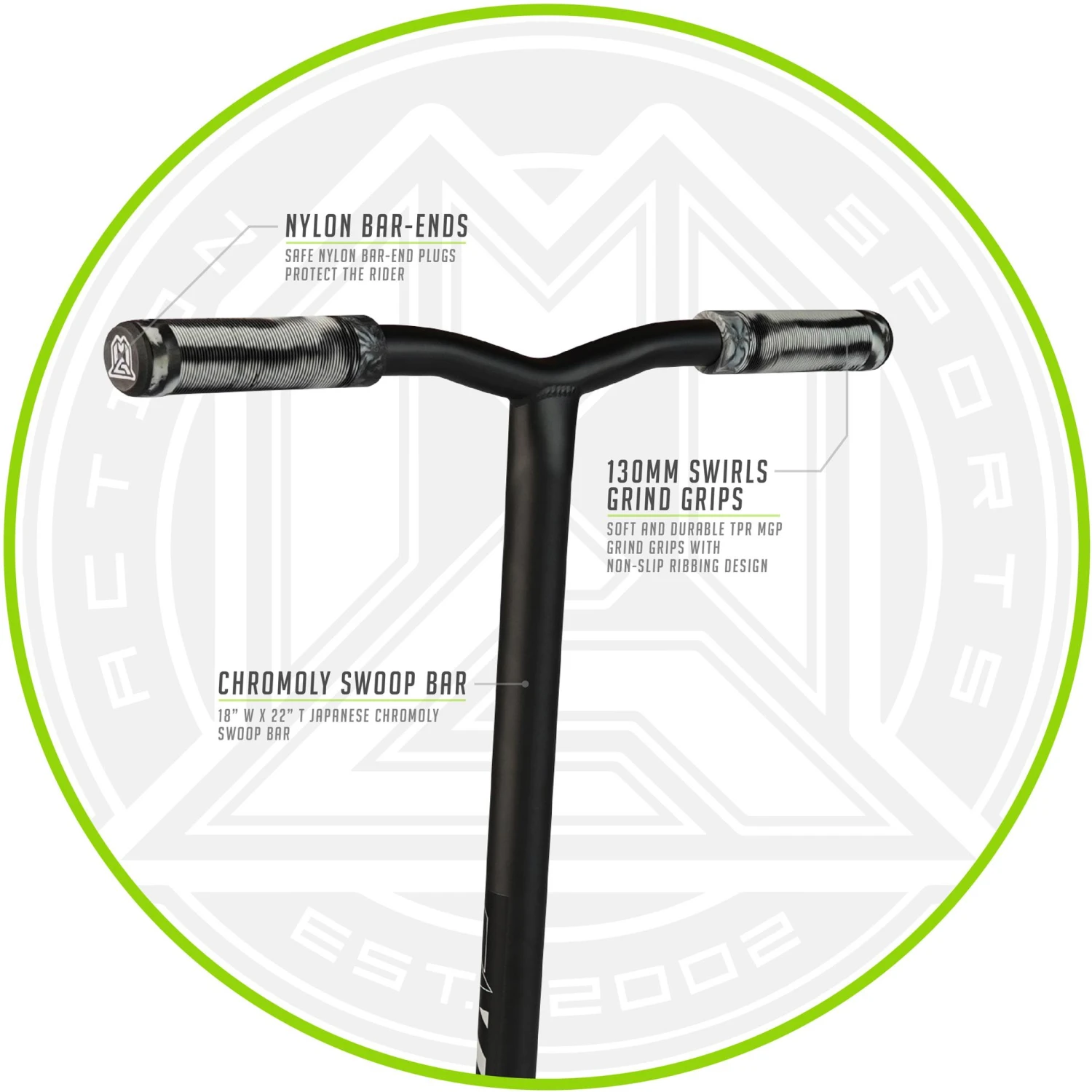 2020 Upgrades – The MG Kick Pro V5 Scooter is upgraded from top to bottom with 150mm TPR Swirls Flangeless Grind Grips, 1-Piece Chromoly Swoop T-Bar, Integrated Rounded Box Deck with Internal Fluting and 110mm Aluminium Hollow Core Wheels. The Kick Pro is amazing value for money and is one of the best price per spec stunt scooter on the market today.