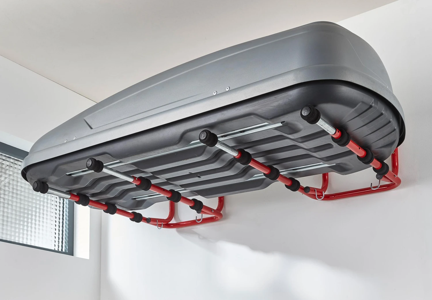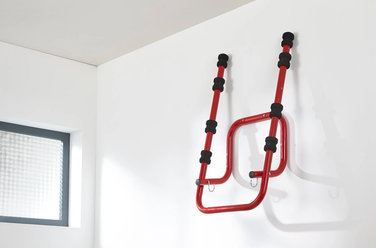 The Mottez Folding & Telescopic 4 Bike Wall Rack is a great way of storing your bikes in the garage or home. Its very easy to install and only needs 4 screw & bolts adapted to your wall (not included), it also comes complete with 2 hooks to hang up accessories. Its covered in a red epoxy powder painting and has protection with 8 heavy duty foam pads. The tube is 30 x 1.5mm and it also has a telescopic inner tube to carry a fourth bike.