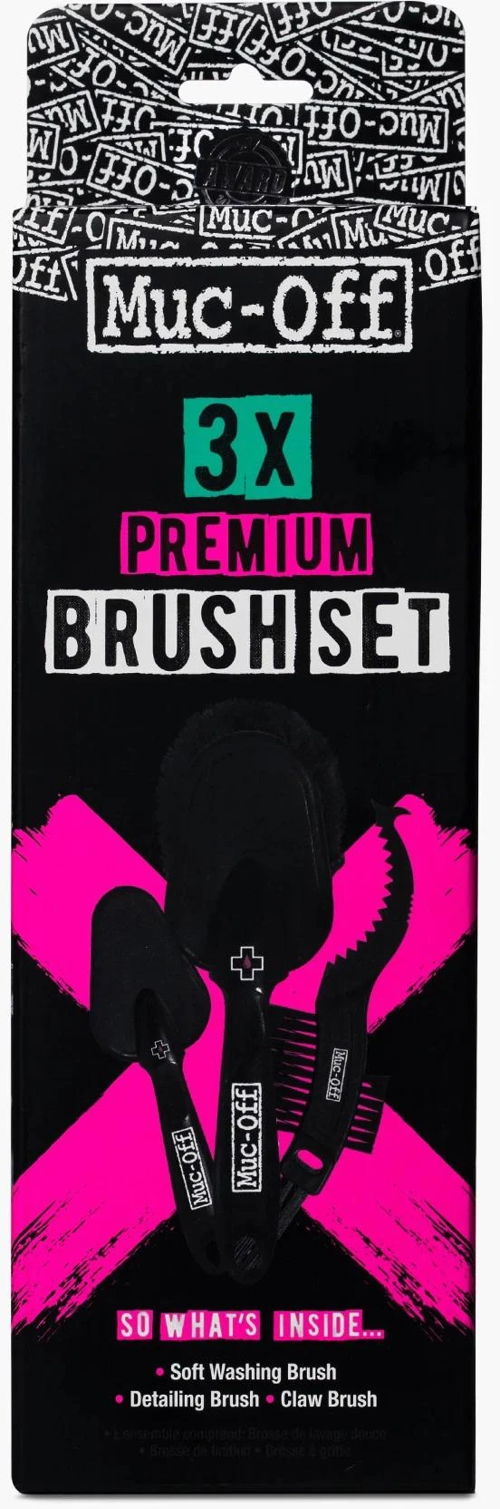 The Muc-Off 3 x Brush Set is a perfect gift for the keen cyclist in your life! It contains a Soft Washing Brush, Detailing Brush & Claw Brush. The soft washing brush features a sintered bristle compound that's designed to clean your wheels and components while caring for delicate finishes. Its new design has a tough, impact resistant handle that won't slip in extreme conditions, an oversized head for fast cleaning of large areas and rubberised impact zones for maximum protection. The Detailing Brush is ideal for reaching hard-to-shift dirt. Its all new design features a tough, impact resistant handle that won't slip in extreme conditions, durable nylon bristles and rubberised impact zones for maximum protection on delicate finishes. The Claw Brush features high quality construction with triple brush heads with tough nylon bristles and an integral scraper.