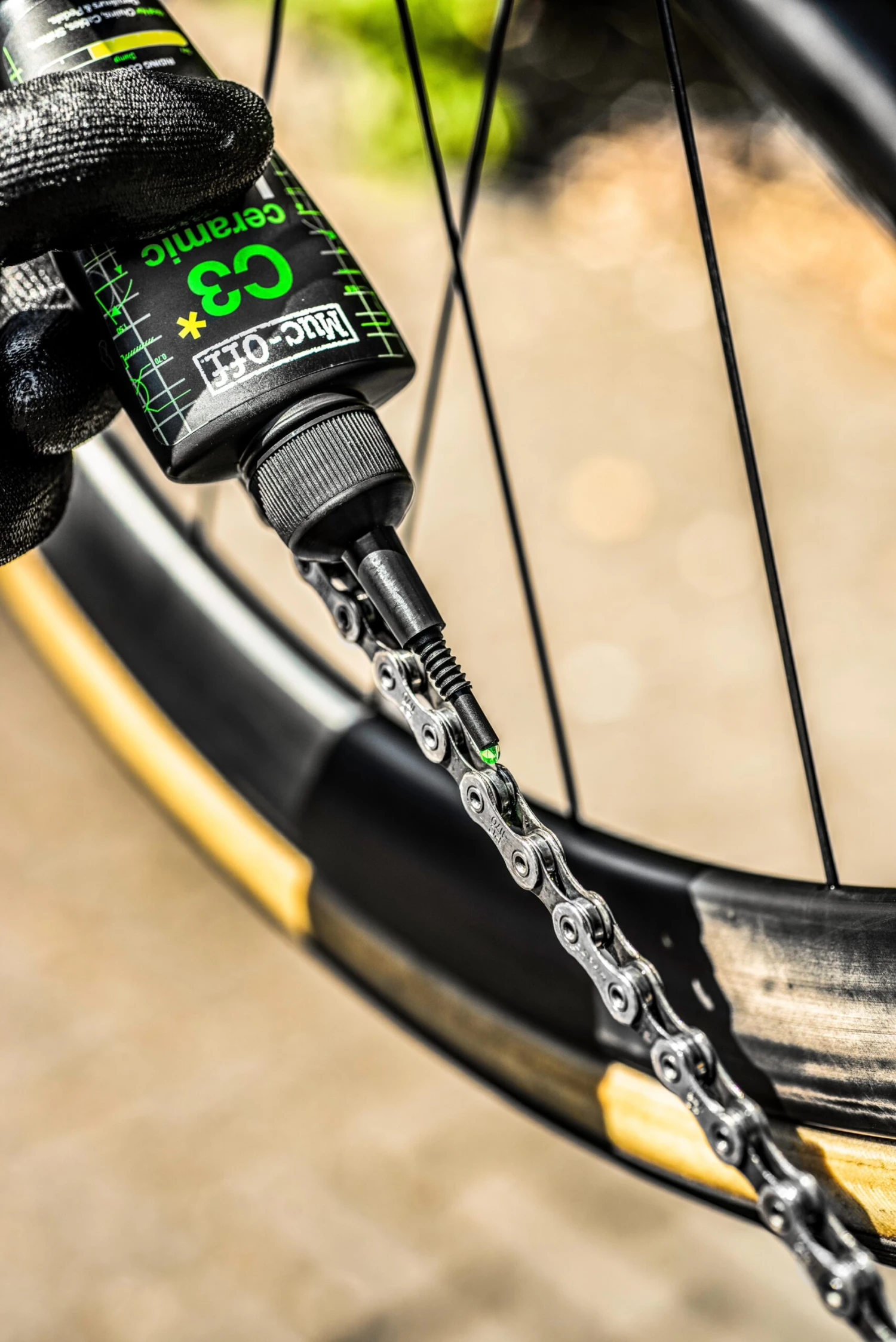 - Shake bottle vigorously and apply a moderate amount of C3 Dry Lube to the inside chain link, whilst spinning pedals in a reverse motion