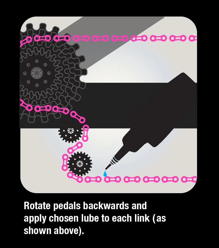 - Shake bottle vigorously and apply a moderate amount of Hydrodynamic lube to the inside chain link, whilst spinning pedals in a reverse motion