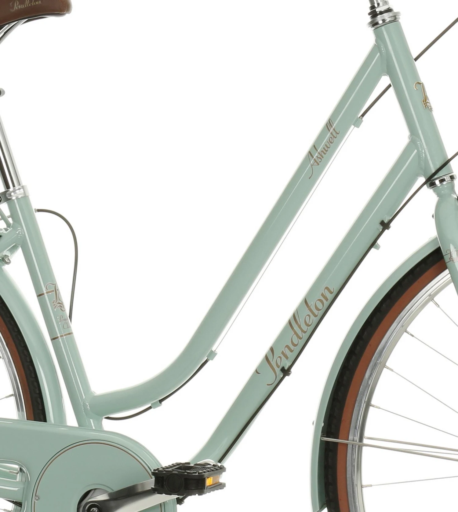 The Pendleton Ashwell Hybrid Bike – Sage has a stylish 'Dutch' step through frame giving it that irresistible classic flavour to its design. Pendleton's signature mudguards and full chaincase will protect you from any unpleasant grease marks and will reduce wear and tear. This bike is suitable for any adult, its versatile/classic design ensures anyone's cycling desires are met, whether that may be popping to the shop, meeting friends for lunch, or simply cruising around.