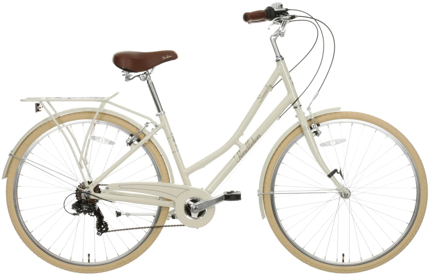 The Pendleton Somerby Hybrid Bike – Bone is the personification of style coupled with a classic design The classic step-through frame makes hopping on and off easy, the beautiful Somerby has a sprung leather-style saddle for comfort with 7 speed Shimano gearing to help you up hills.