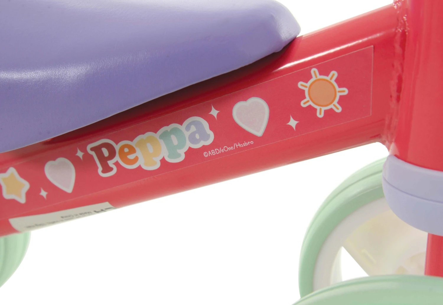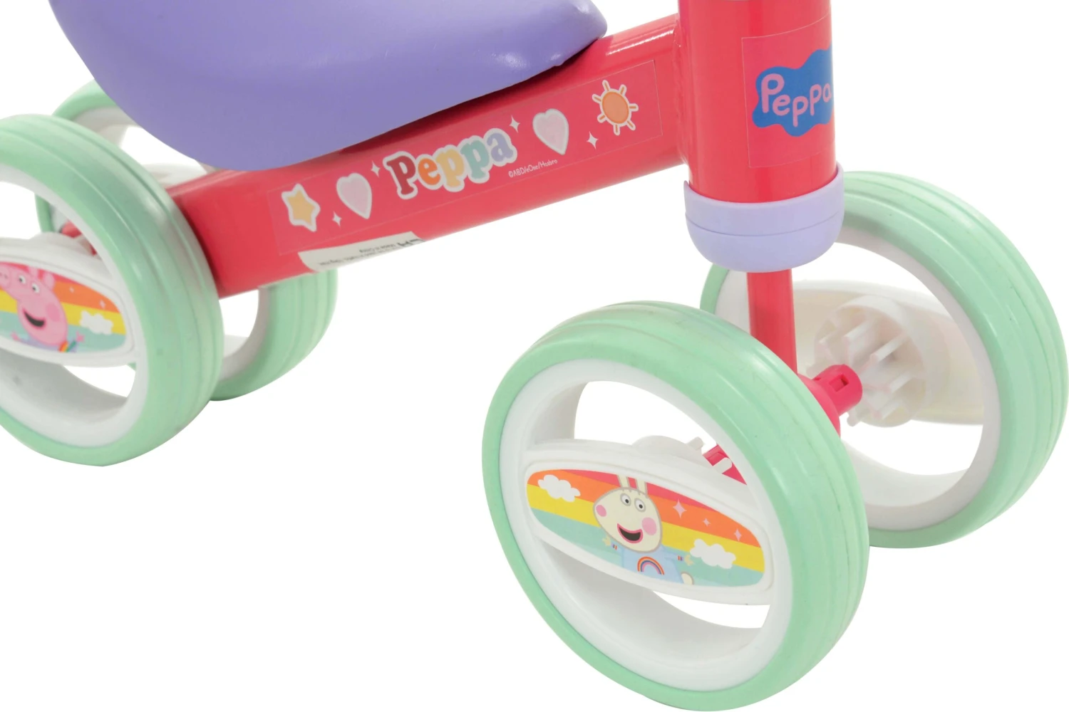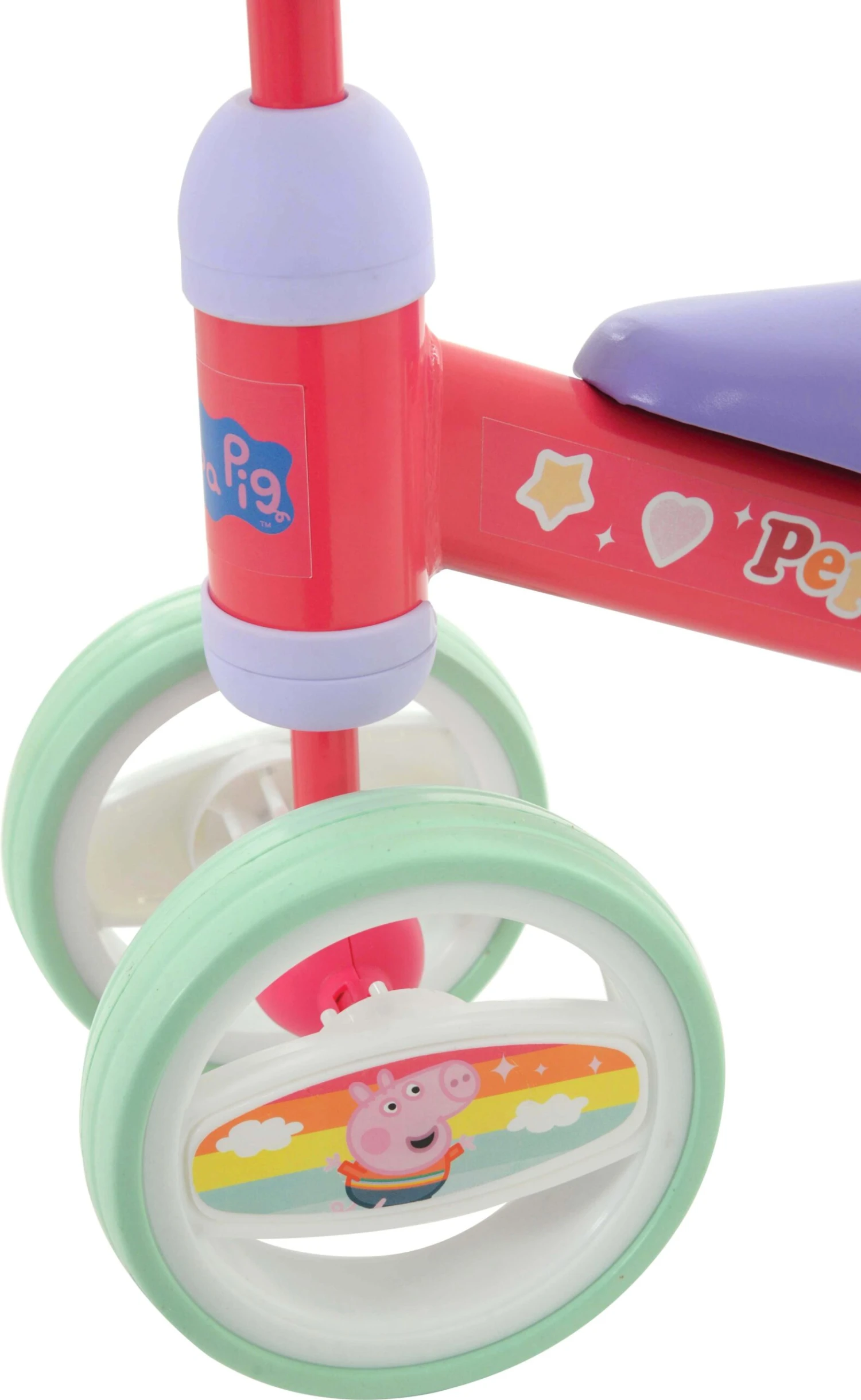 Play with Peppa! Get on the move with this super cool ride-on featuring character favourites Peppa and George! Perfect for little ones finding their feet, this ride-on is not only designed for comfort with it's moulded seat and soft handlebar grips, but safety also with double rear wheel design provides extra anti-tip and stability and study steel frame.