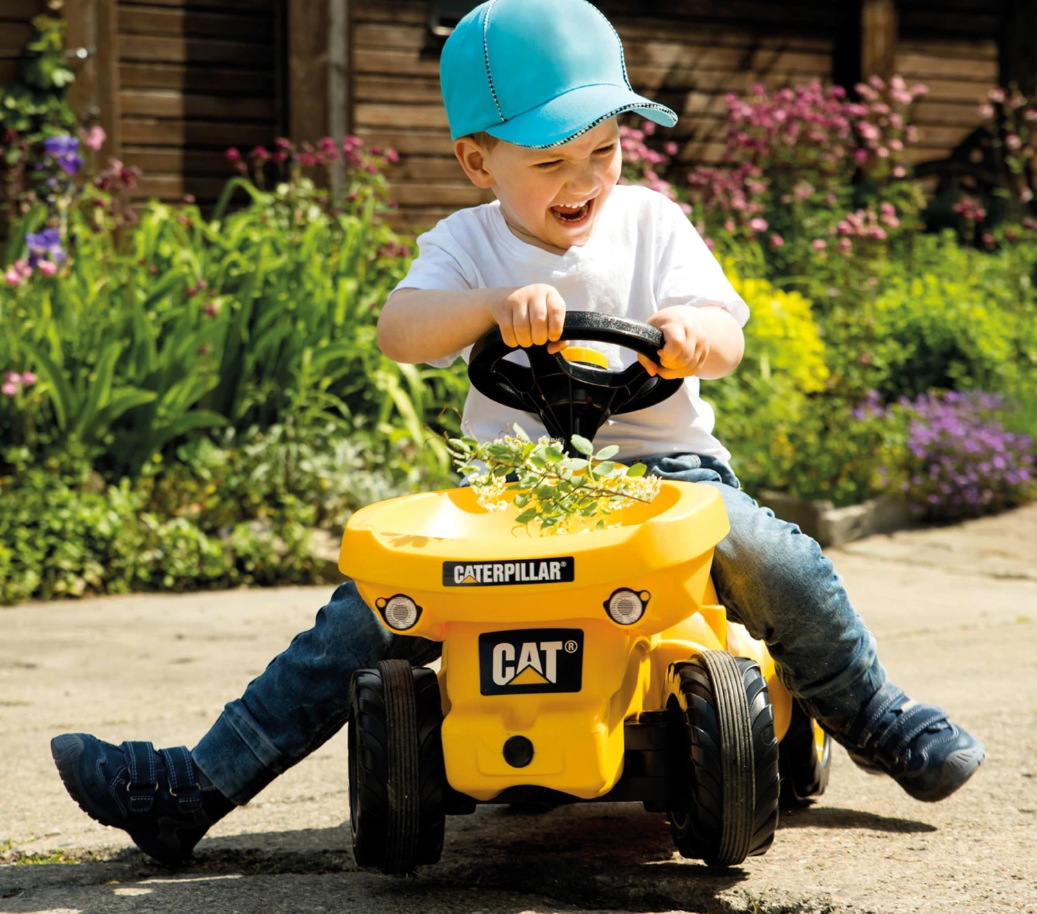 This realistically styled Caterpillar mini foot to floor dumper features a tipping dumper, a steering wheel with an integral squeaky horn, large whisper quite wheels and a knee indentation that enables your child to scoot along.
