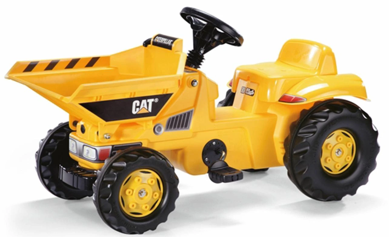This chain driven Caterpillar licensed dumper truck has anti-slip pedals, tipping front dumper, rear hitch pin, chunky steering wheel and rugged style wheels.