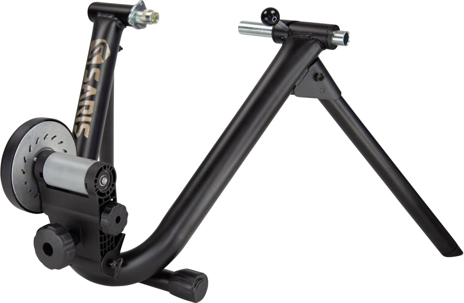 No fancy gizmos. No wires. No fuss. If you’re looking for an easy way to ride your bike indoors, call off the search – you’ve found it. Whether you're training for a local charity ride or working to beat your friend’s FitBit score, the Saris Mag indoor bike trainer can help you make it happen. Simply connect the trainer to the rear wheel of your bike, hop on and pedal away. Plus, the Mag comes with five adjustable levels of resistance so you can adapt every ride to your liking. This trainer is designed to fit common road and mountain bike frames with included steel quick release skewer and is compatible with rear dropout spacing: 120mm, 130mm and 135mm. Resistance unit roller allows for 700c, 26″, 27″ and 29″ wheel sizes – up to a 2.0 tyre.