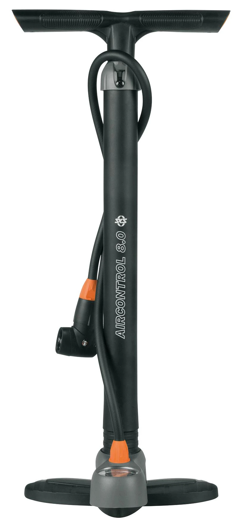 The SKS Air Control 8.0 Floor Pump is a lightweight plastic floor pump with precision gauge. It has a multi-valve-head with thumb lock lever and is compatible with both Presta and Schrader valves.