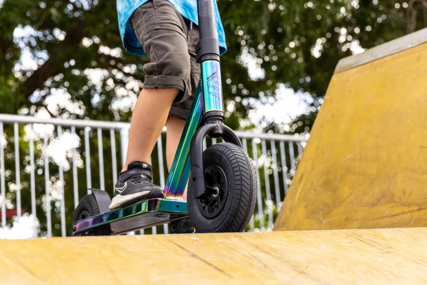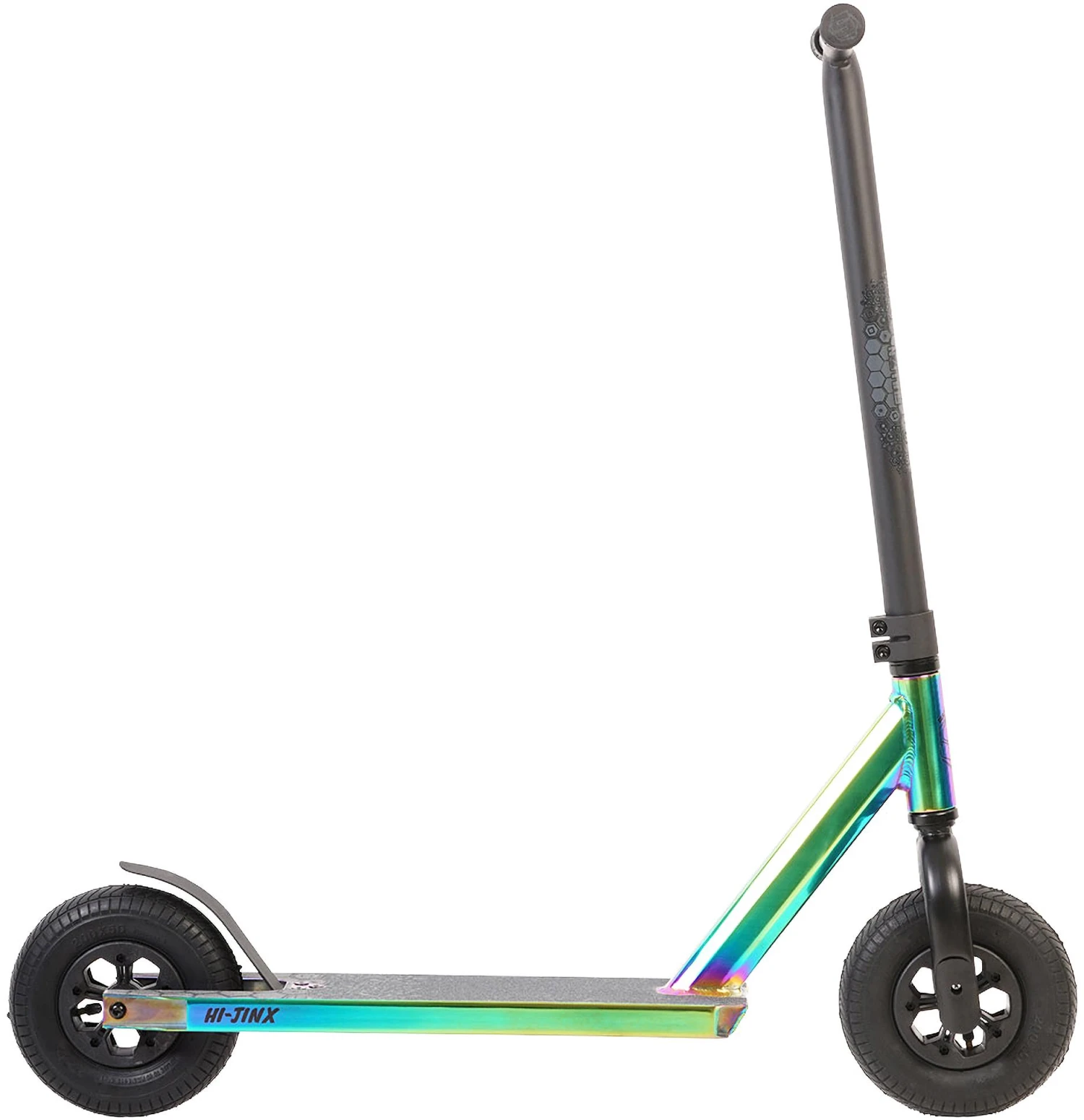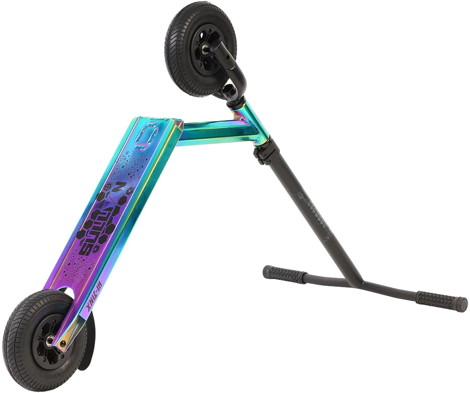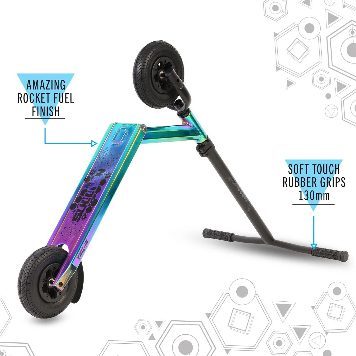 This dirt scooter also features a slim stack headset, IHC compression fork and our 5 spoked wheels with ABEC 9 bearings to keep you rolling for longer. The 45mm x 165mm pneumatic tyres provide excellent grip both on and off road and the powerful rear foot break will keep you firmly in control.