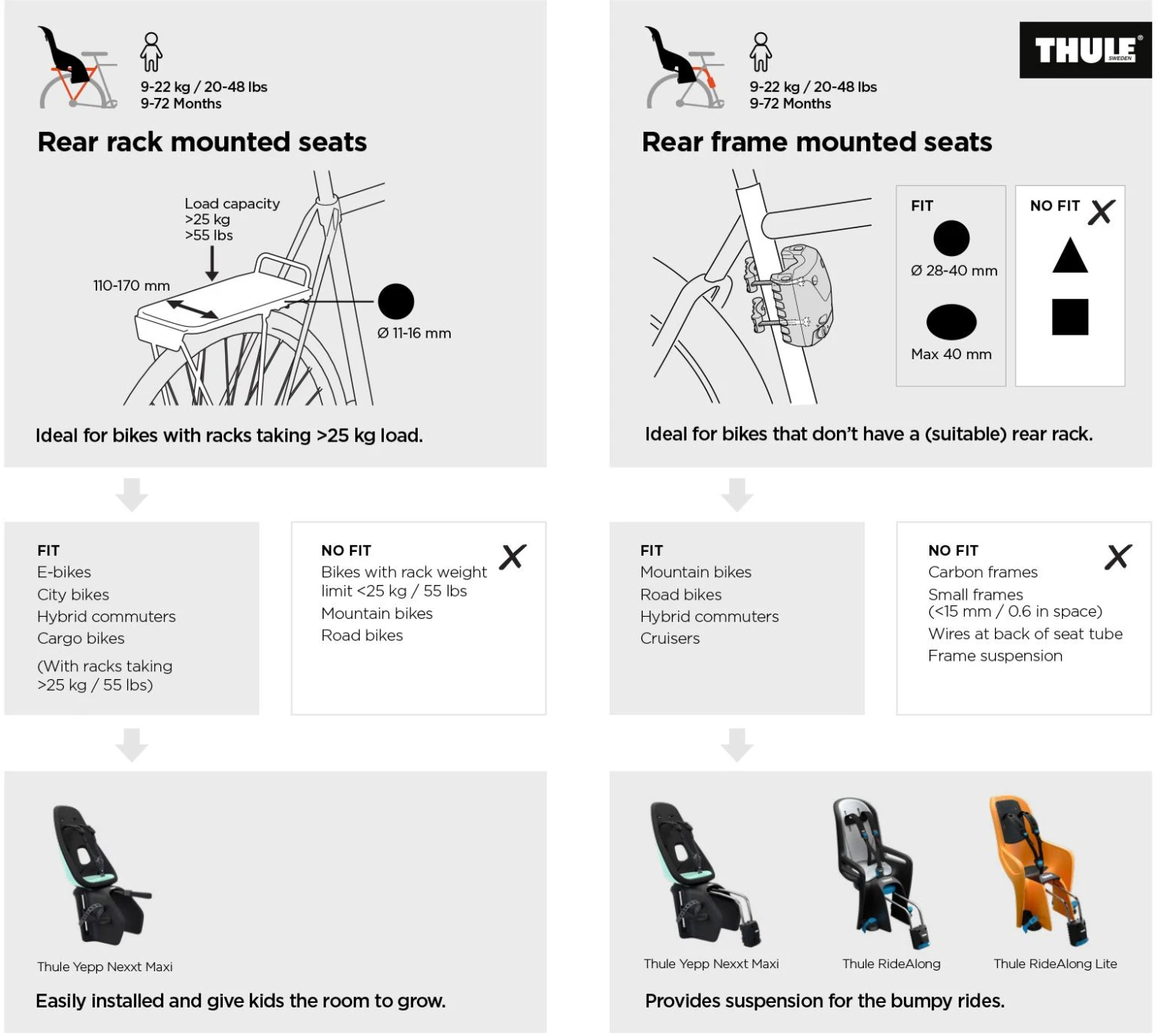 The comfy Thule RideAlong Child Bike Seat can be mounted/ dismounted from your bike in seconds. Maximising comfort and safety with a custom fit thanks to the adjustable padded 5-point harness. The childproof safety buckle with large buttons allows you to secure your child quickly and easily. The single-hand adjustable foot rests and foot straps will grow as your child does to ensure a perfect fit. There is also a DualBeam suspension system to absorb road shocks. Ideal for naps on-the-go with five different reclining options (up to 20°) that can be easily adjusted with just one hand.