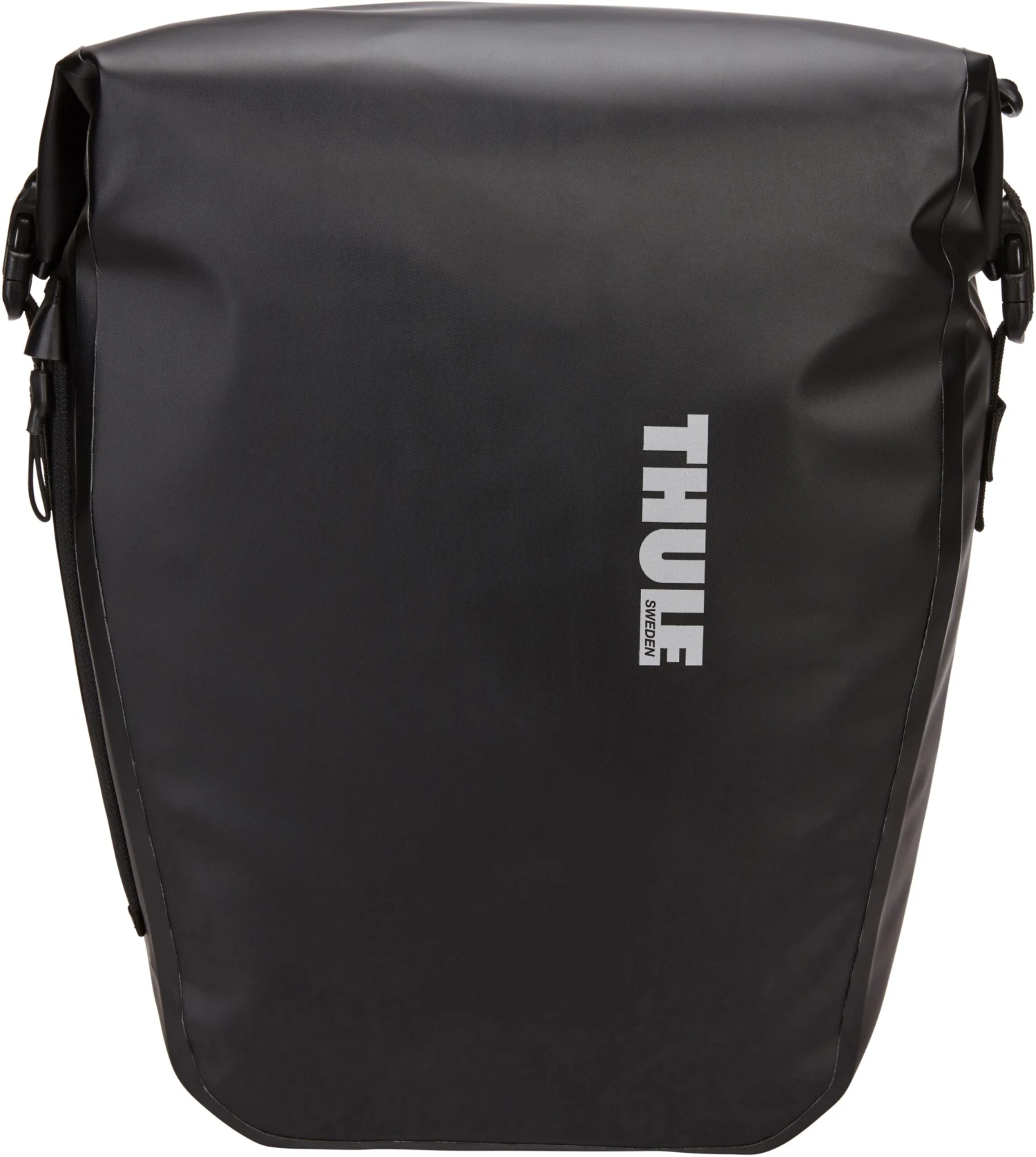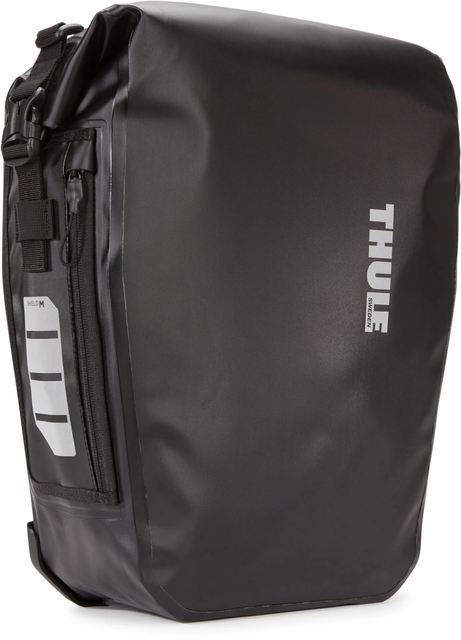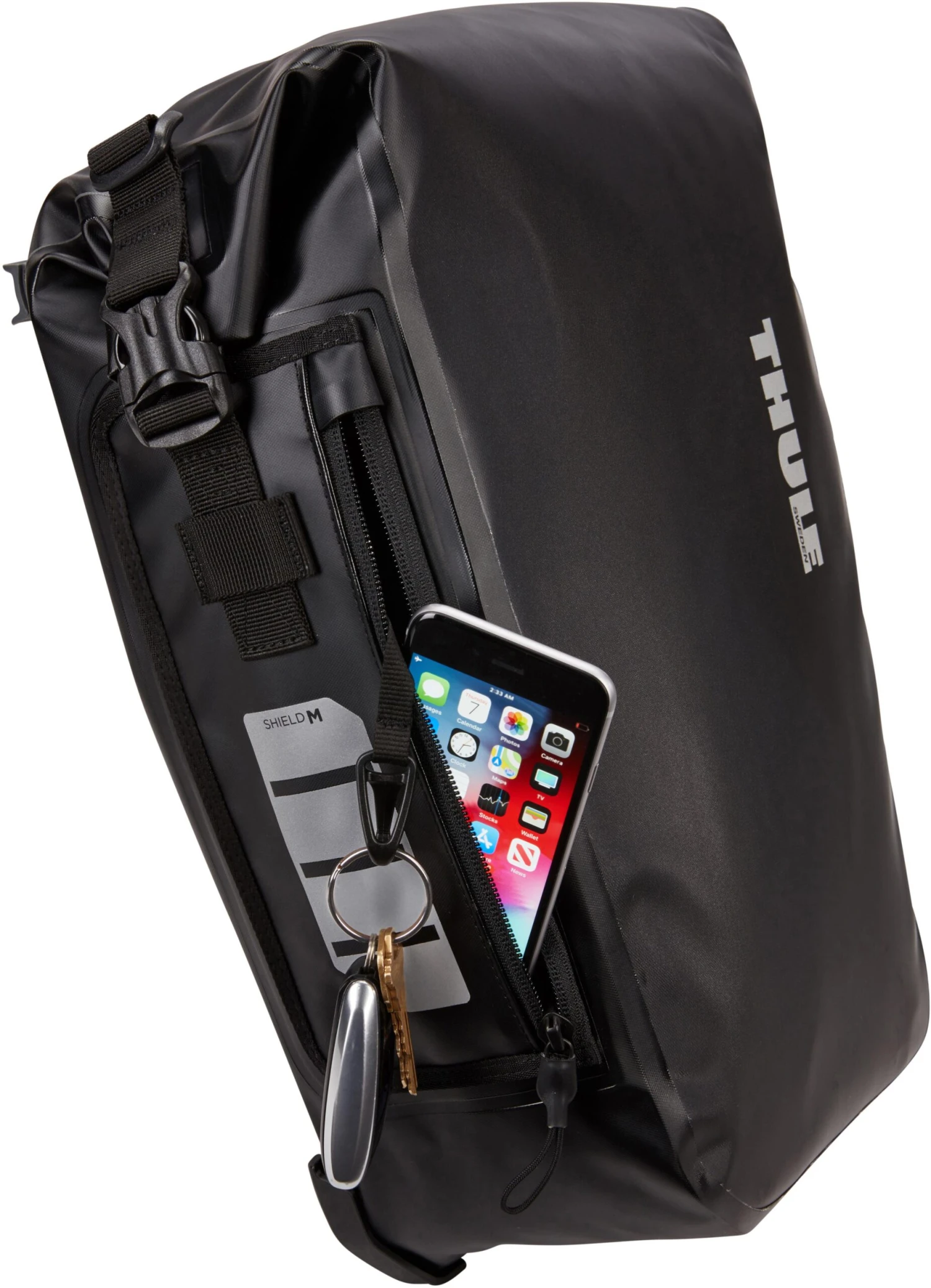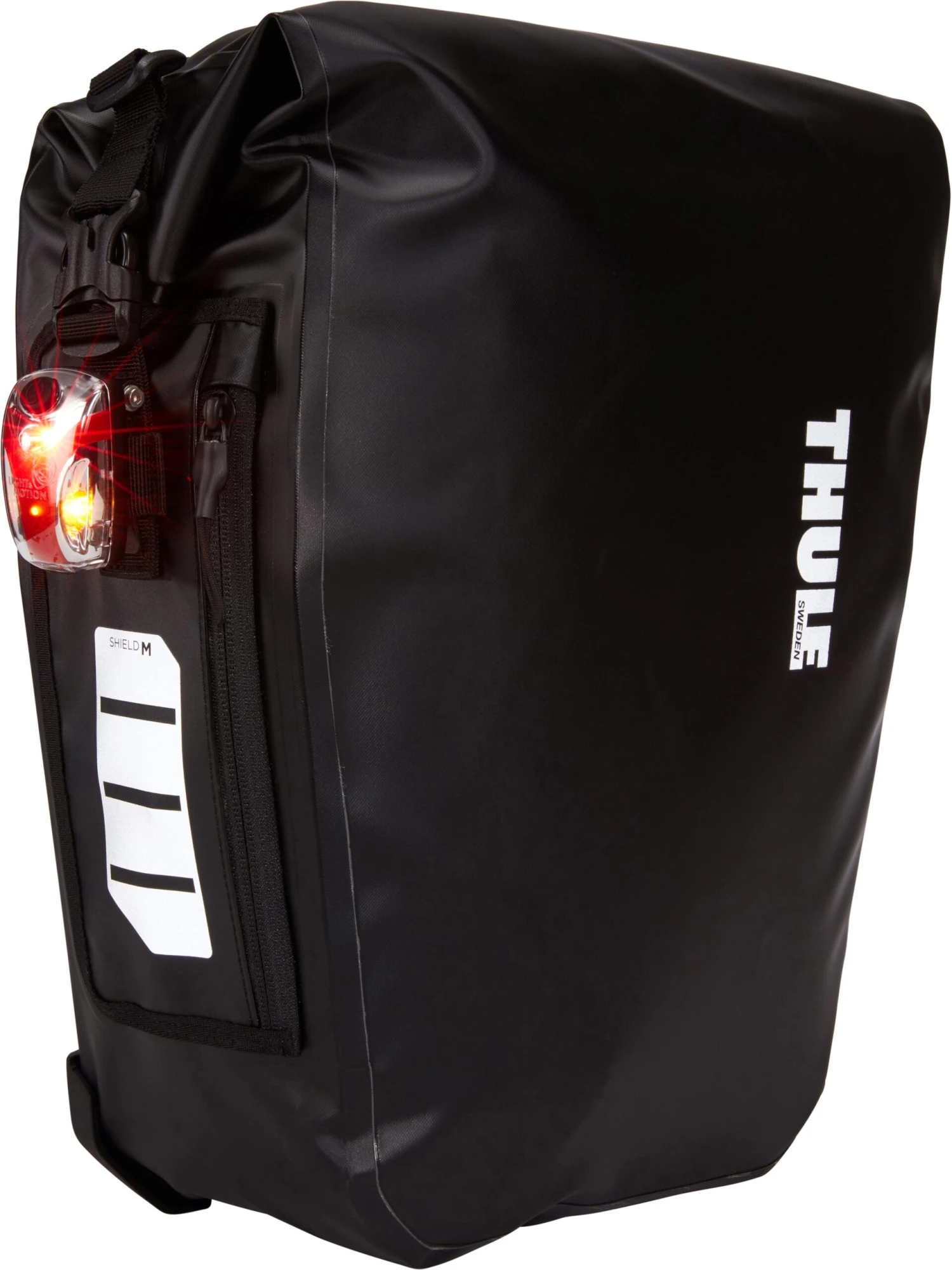 Thule Shield pannier 17L is an urban bike bag perfect for bike commutes. City-dwellers on their daily commute will appreciate the padded laptop sleeve for a 15″ MacBook® or 14″ PC, and the additional pocket for a 10″ tablet. Installing the pannier on your 8-16mm bike rack is easy, and once installed, attaching and detaching the bike pannier takes mere seconds. The bike light attachment loops and reflective elements keep you visible when you're cycling at night. These panniers also have a certified rating of IPX4 on the internationally recognized IP waterproof scale, which means they are highly water-resistant in heavy rain and will keep your items dry.