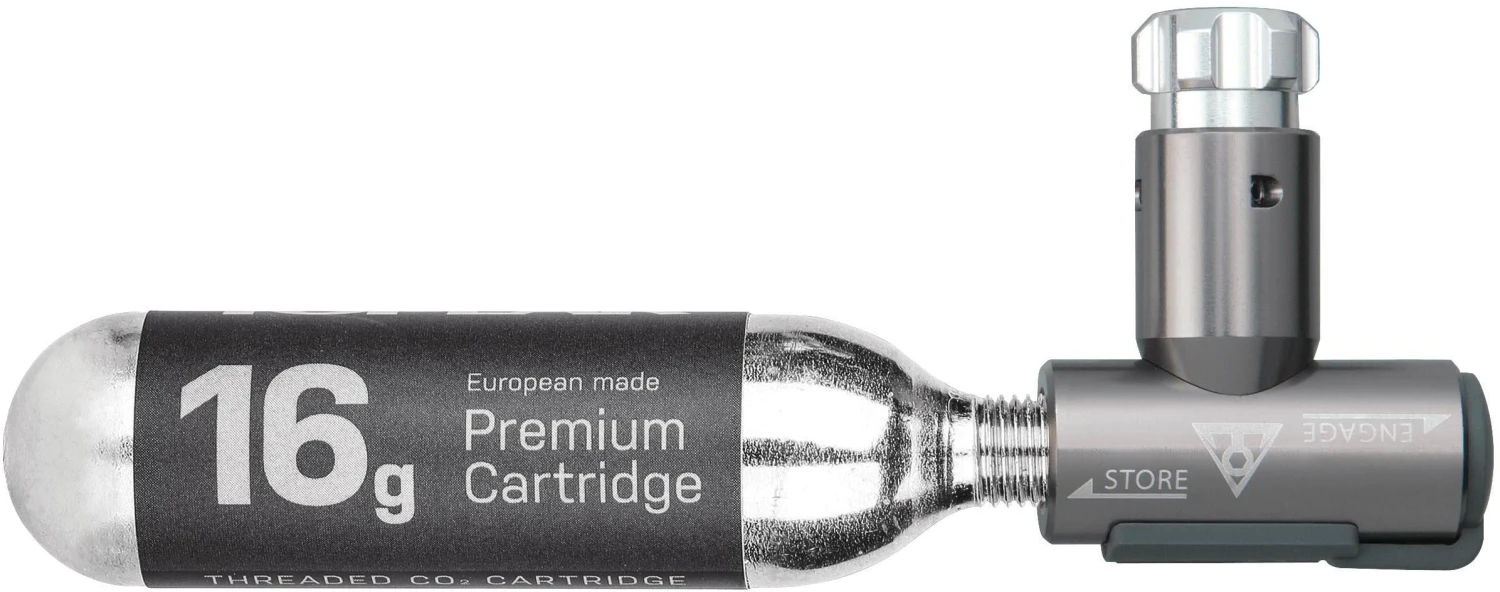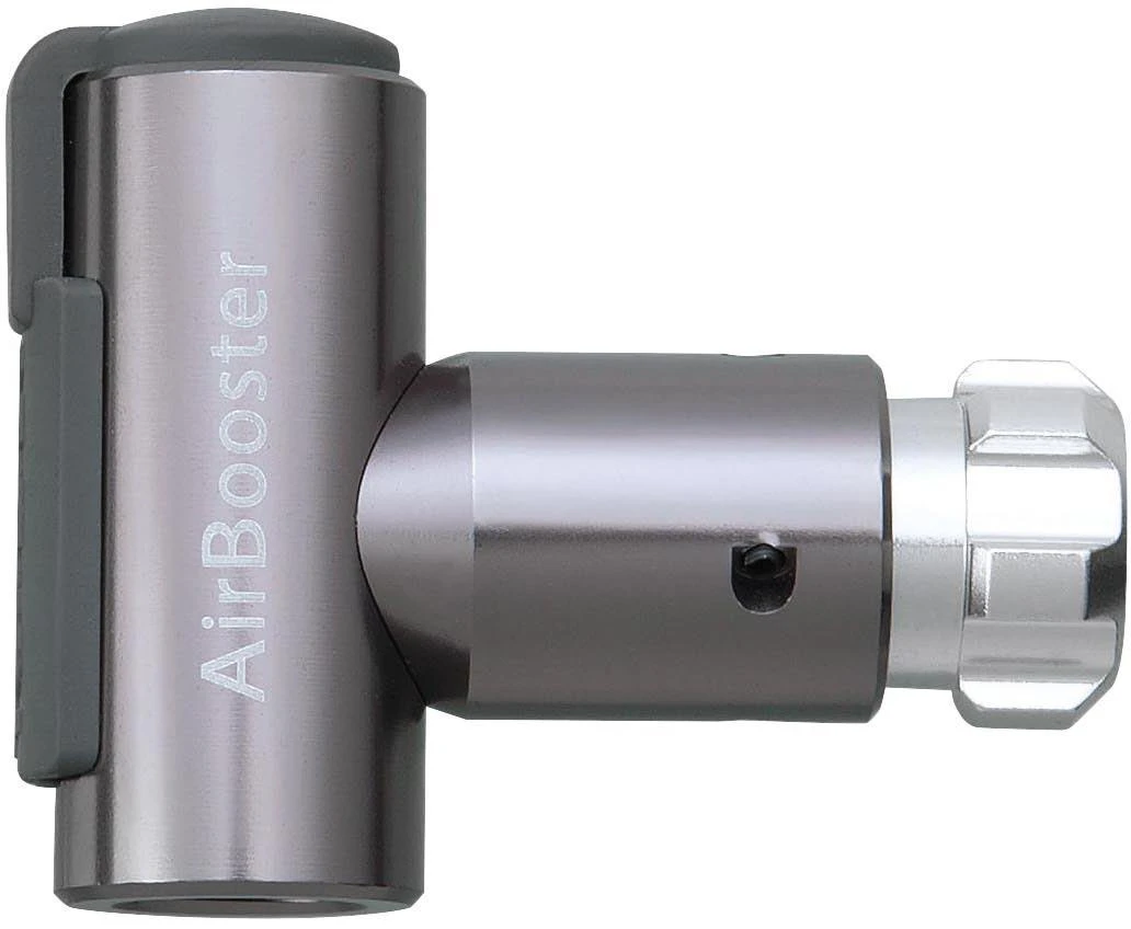 Precision CNC machined from solid aluminum, the angled head AirBooster fits Presta and Schrader valves and its special design allows the user to adjust the flow while filling the tire. Double-ended design allows cartridge storage. The supplied durable silicone CO2 Sleeve protects hands during inflation.