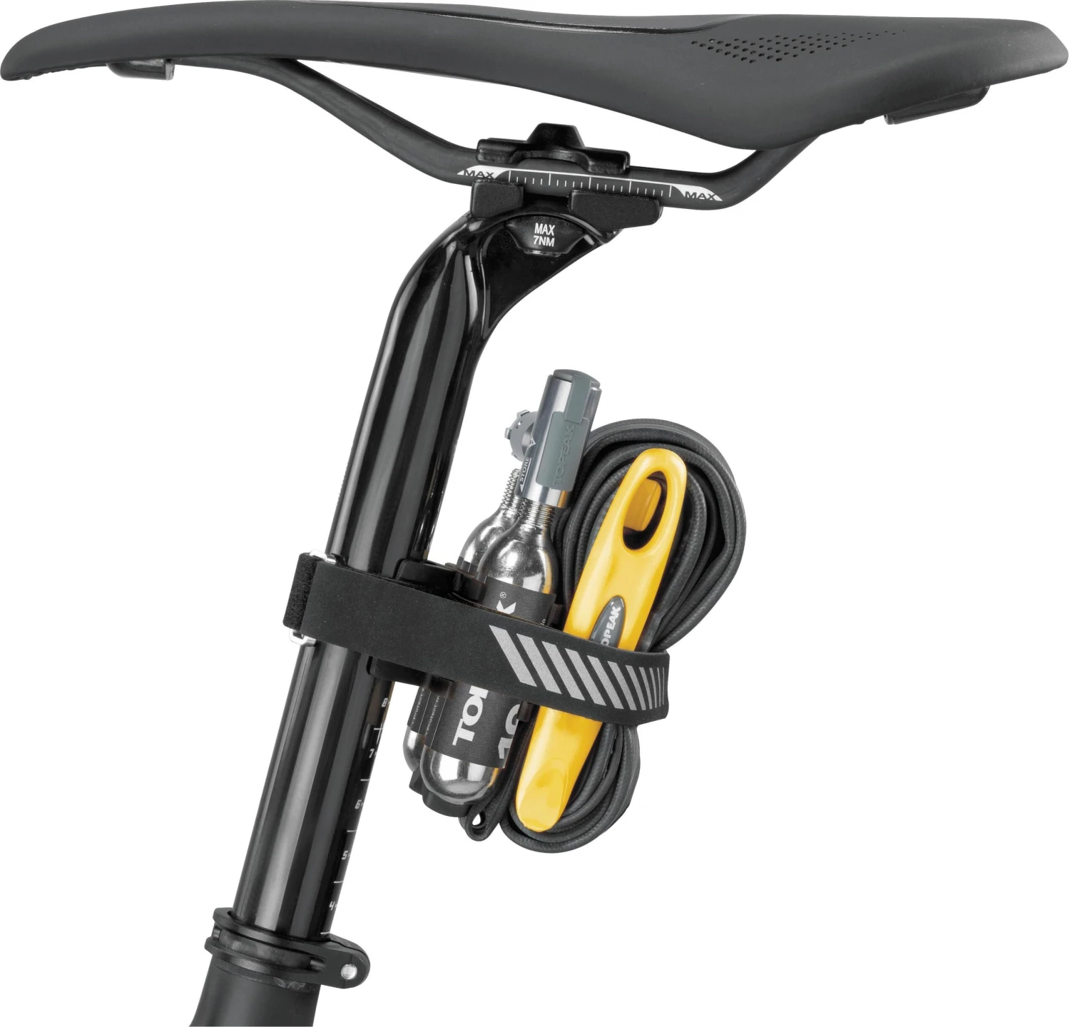 The unique mounting module straps to the aero or round tube, and provides lightning fast access to the Air Booster inflator, extra CO2 cartridge and tyre levers. The perfect CO2 tyre repair solution for racing, endurance or triathlon events. Use only Topeak 16g CO2 cartridges.