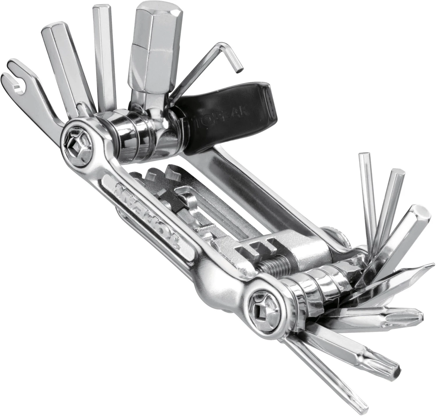 A precision full metal 23 function mini tool made to handle any road or trailside repair. T10 and T25 Torx wrenches simplify hydraulic disc brake work. Includes self-tightening tool and a neoprene bag. The perfect tool for endurance racing, training and touring.