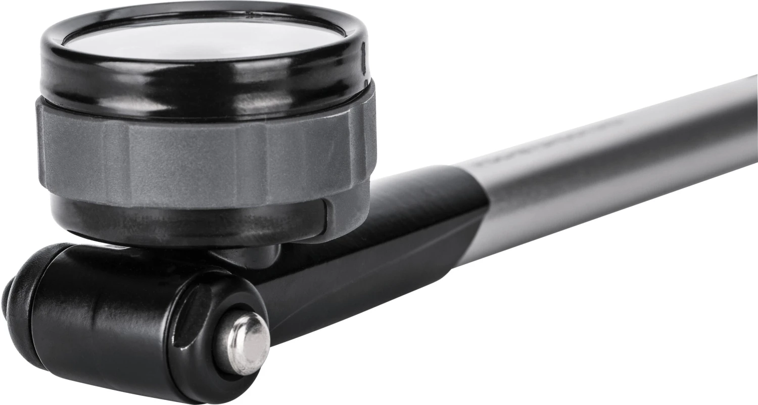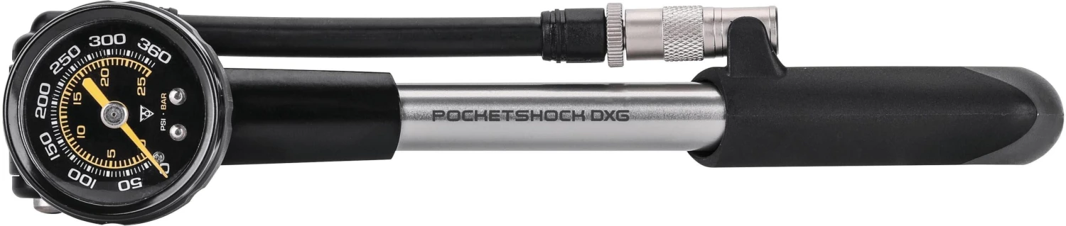 A precision fork and shock pump with an easy-to-read dial gauge for accurate pressure readings up to 360 psi.