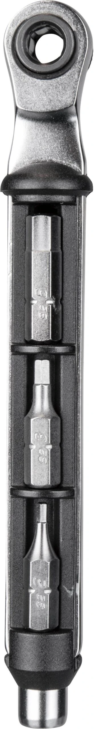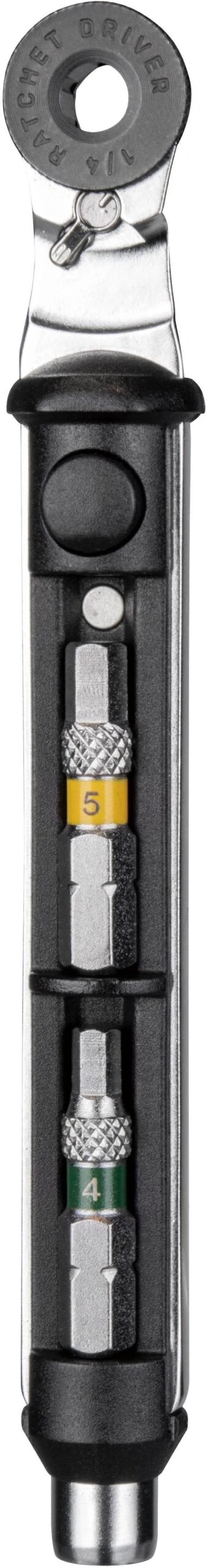 A compact, easy to use and carry ratchet wrench with built-in compartment letting you store five of your most commonly used bits. The separate bit storage pen features a visible window to find the correct bit quickly, while the 4 / 5mm Allen bits with 30mm length makes it easy to reach tough bolt locations.