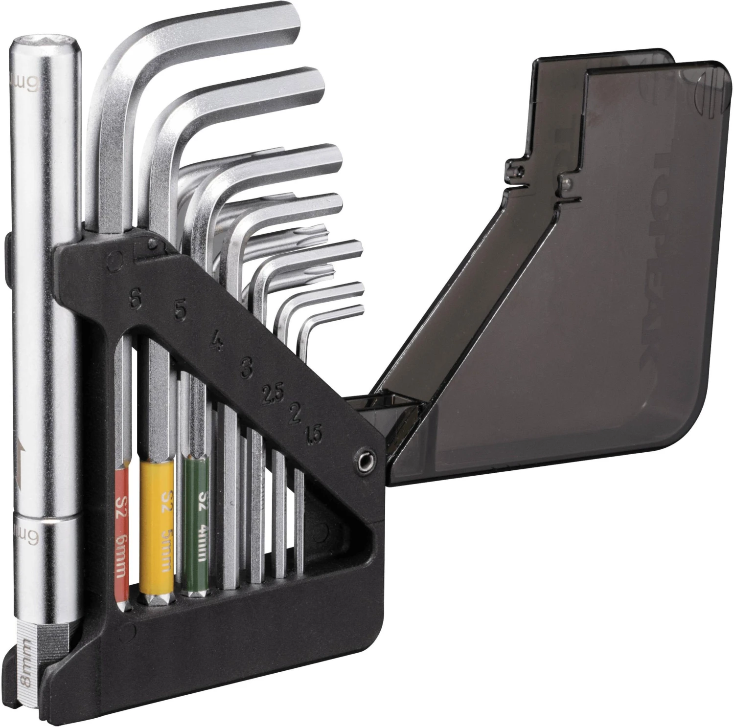 A unique 15 function ball-end Allen wrench set and Torx wrench set stored in an innovative organiser folding body that’s small enough to fit in a jersey pocket or saddle bag. Included extension arm adds leverage on 5/6/8mm hex tools when needed.