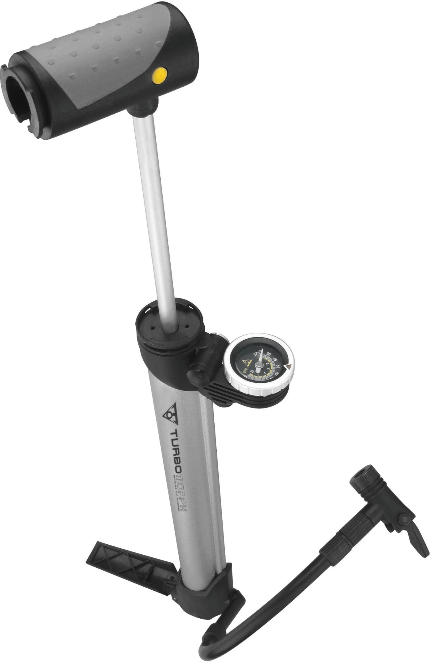 Like bringing your floor pump out with you on the road. High volume barrel with pressure gauge fills wide tyres fast while fold out foot pad and flexible hose make inflation a snap.