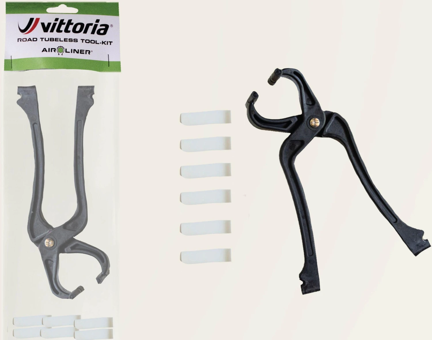 The Tubeless Road Kit is the Vittoria all-in-one package for the best experience on your tubeless tires. The kit contains two Air-Liner Road inserts, one Universal Tubeless Tire Sealant bottle and the Road Tubeless Tool-kit – pliers and clips for easy tubeless tire removal.