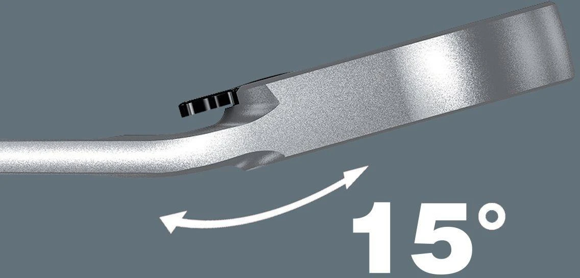 Additionally, the robust two-piece locking element provides for an extreme stability. Comes with a 15deg angled ratchet end for secure work even at high torque.