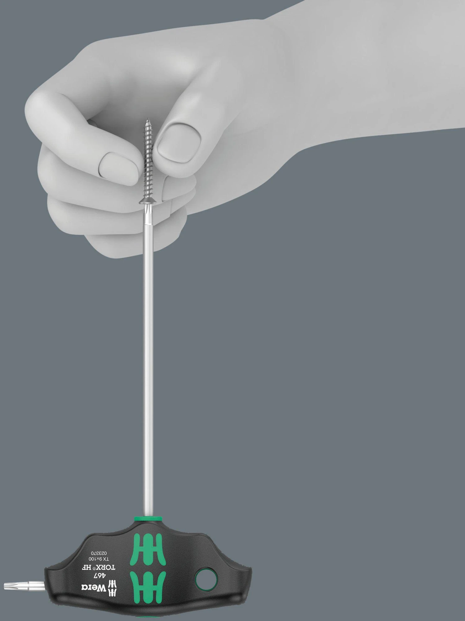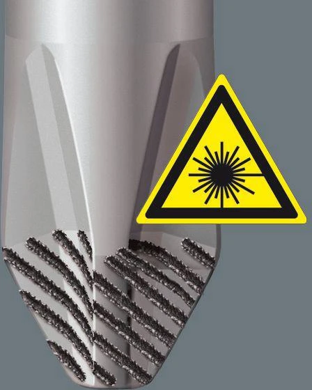 A precisely focused laser creates a sharp-edged surface structure on the tip of the screwdriver. This Wera laser treatment results in an extreme edge allowing the screwdriver to “bites” itself into the screw head, preventing any slips out of the recess.