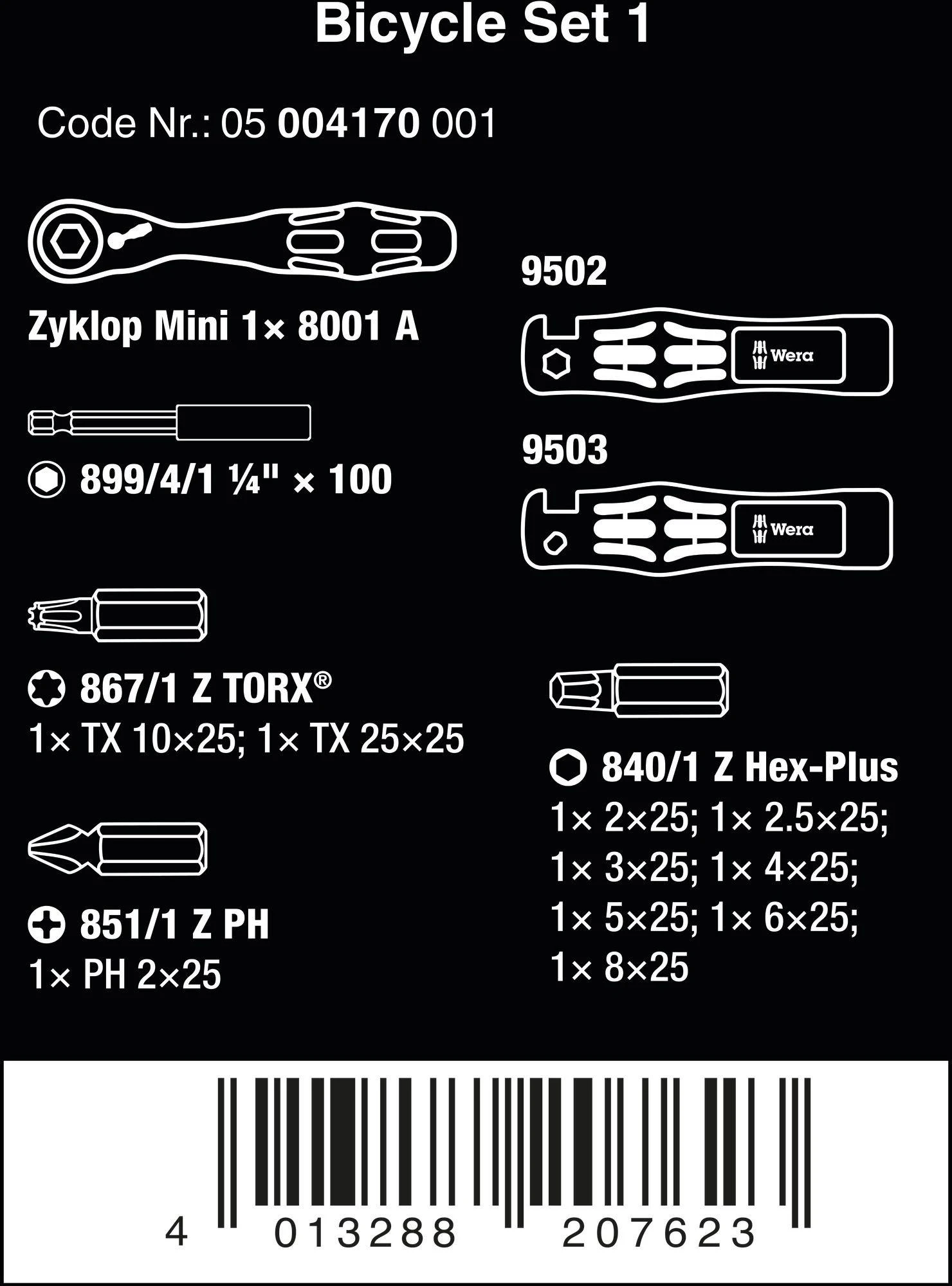 The set includes the Zyklop Mini 1 bit ratchet and 10 bits, which feature all the benefits of Wera-bit technology.