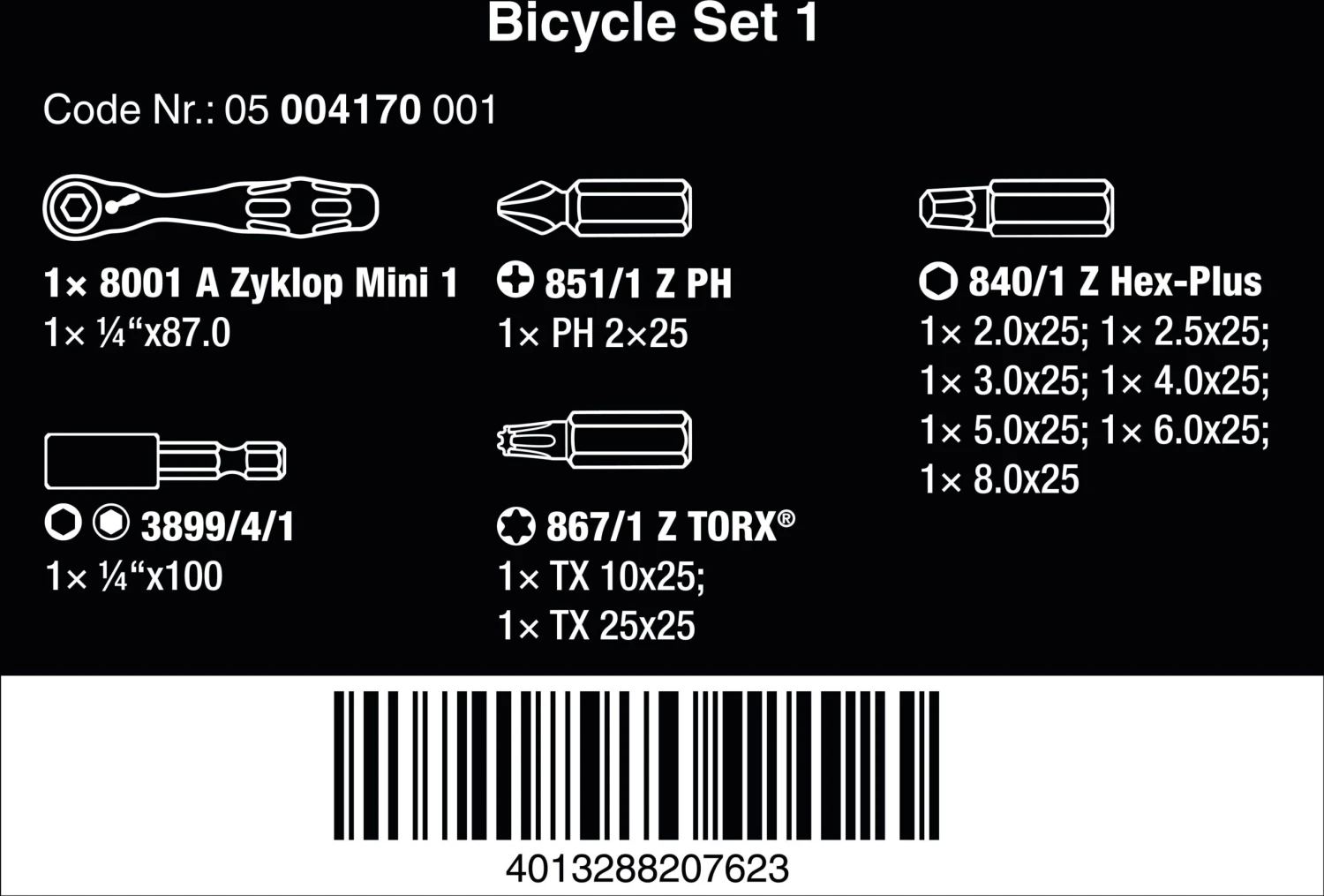 - 7 x Hex-Plus Bits (2mm, 2.5mm, 3mm, 4mm, 5mm, 6mm & 8mm)