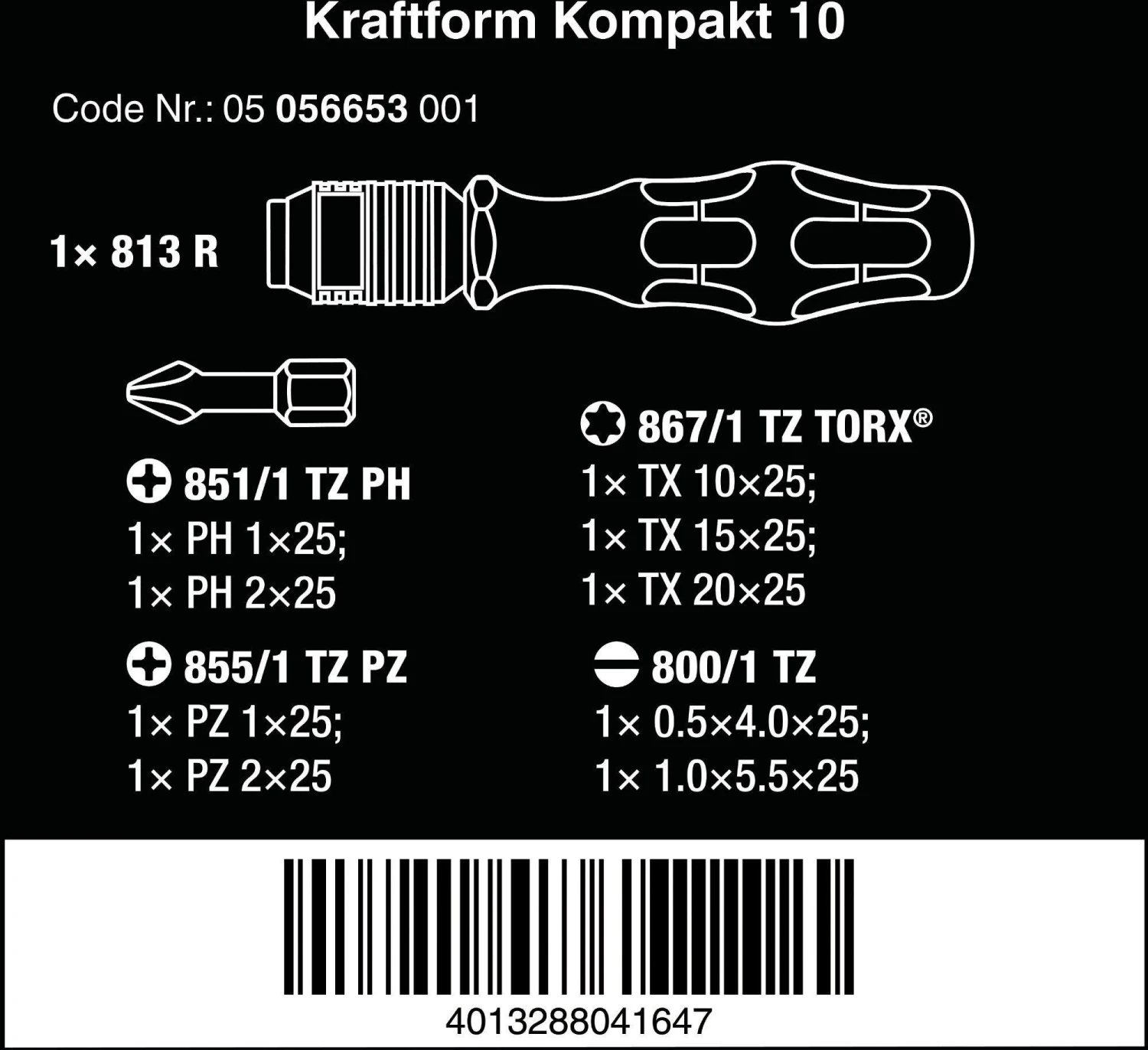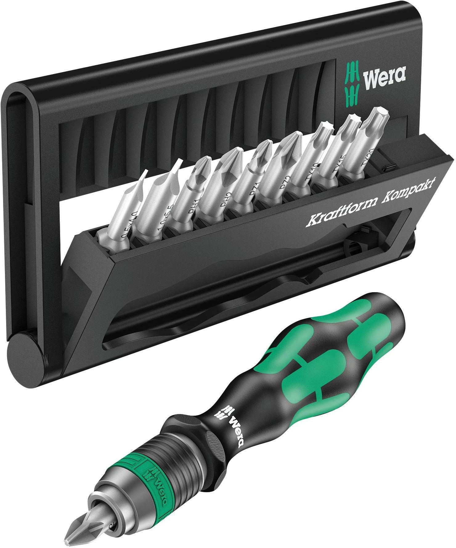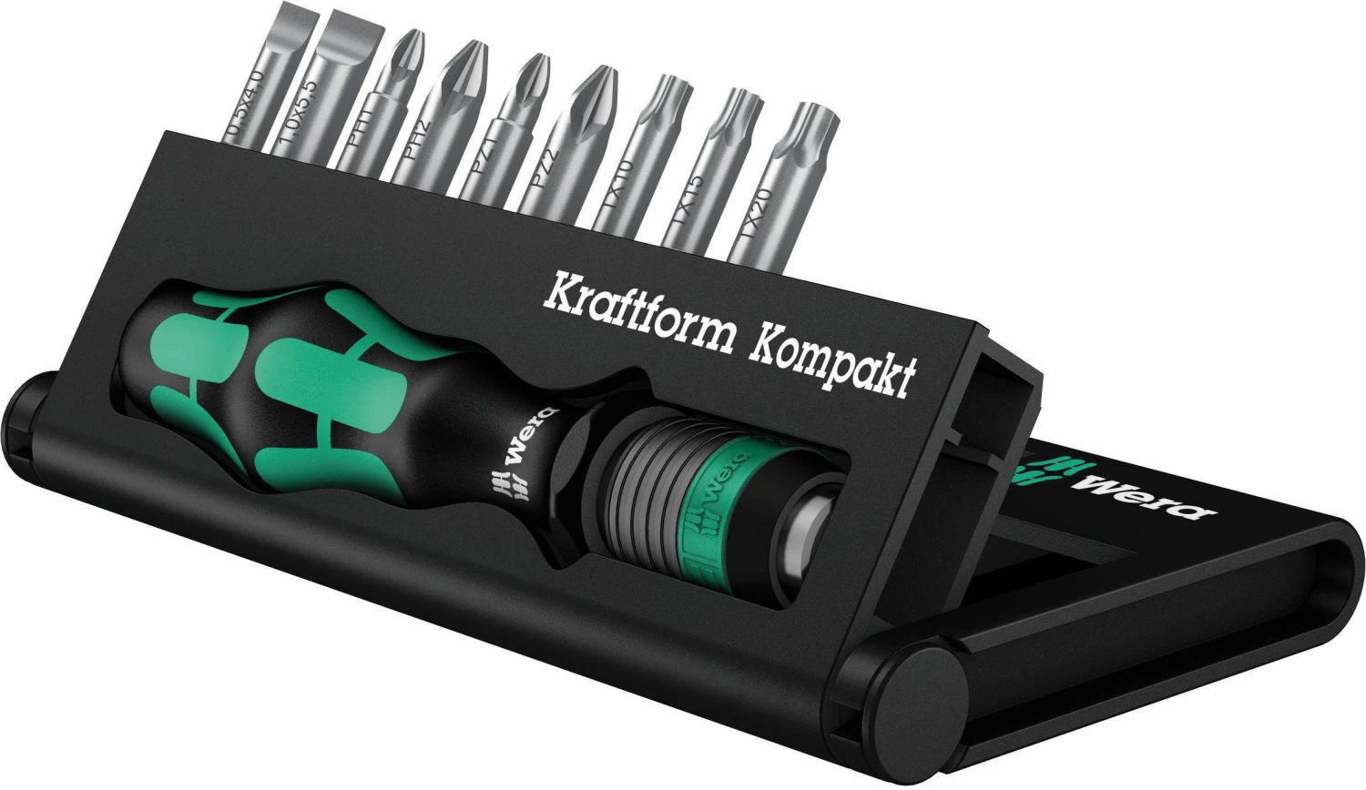 You will not fine a more compact screwdriver set from any other brand! Set includes 9 tough viscous Wera bits for universal use. With torsion design to combat premature wear.Why is the right tool so often not at hand? The reason: too many tools and overly-heavy tool bags can make it bothersome to carry them onsite. So for us it was a clear challenge: to design a tool that is suitable for a whole host of applications and can be easily taken along to jobs at other sites. Our solution: Kraftform Kompakt