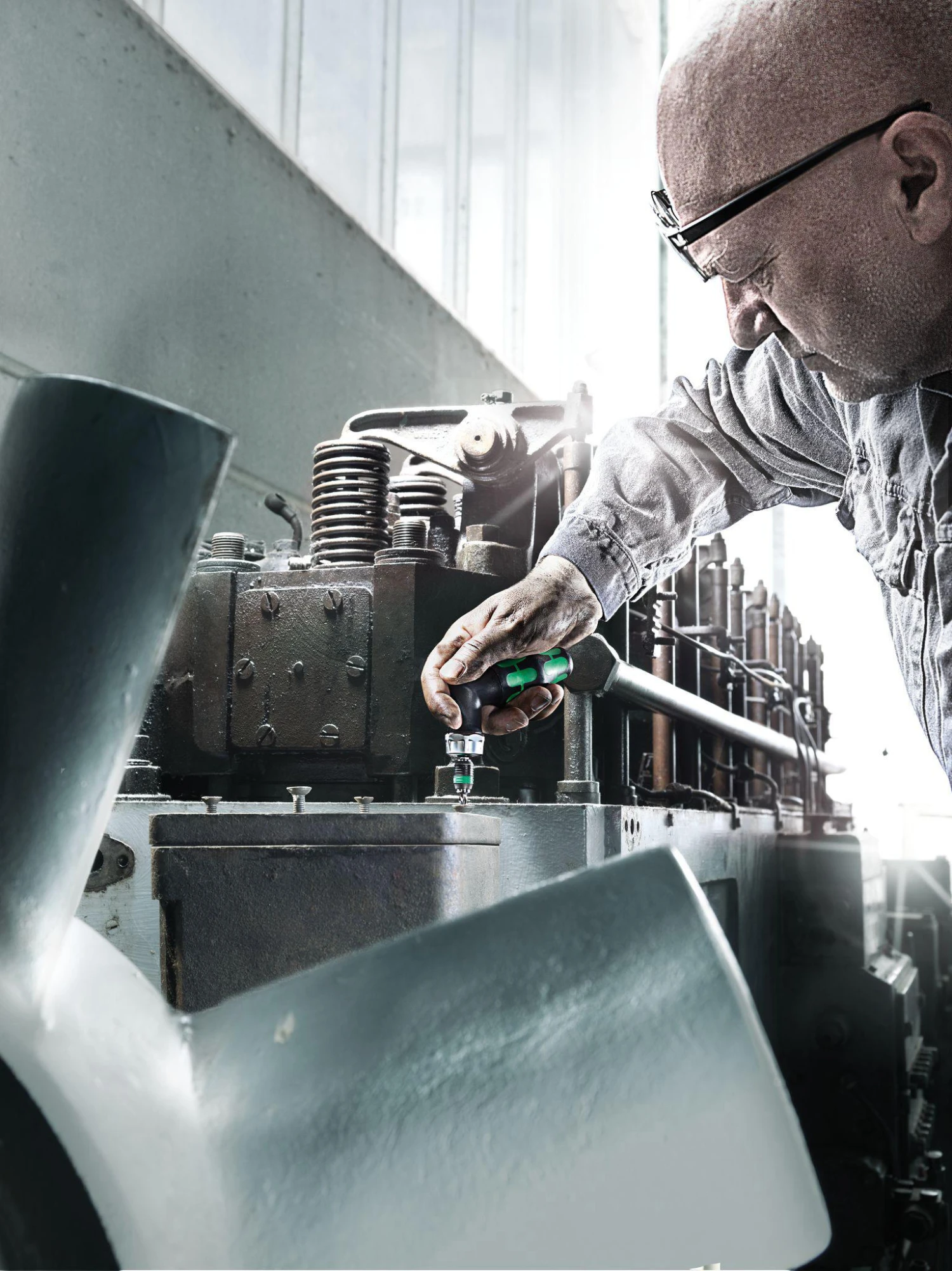 Wera's compact tool with multi-component Kraftform pistol handle for featuring a ratchet function for high working speeds and particularly ergonomic screwdriving. It also features an ingetrated bit magazne in the handle.