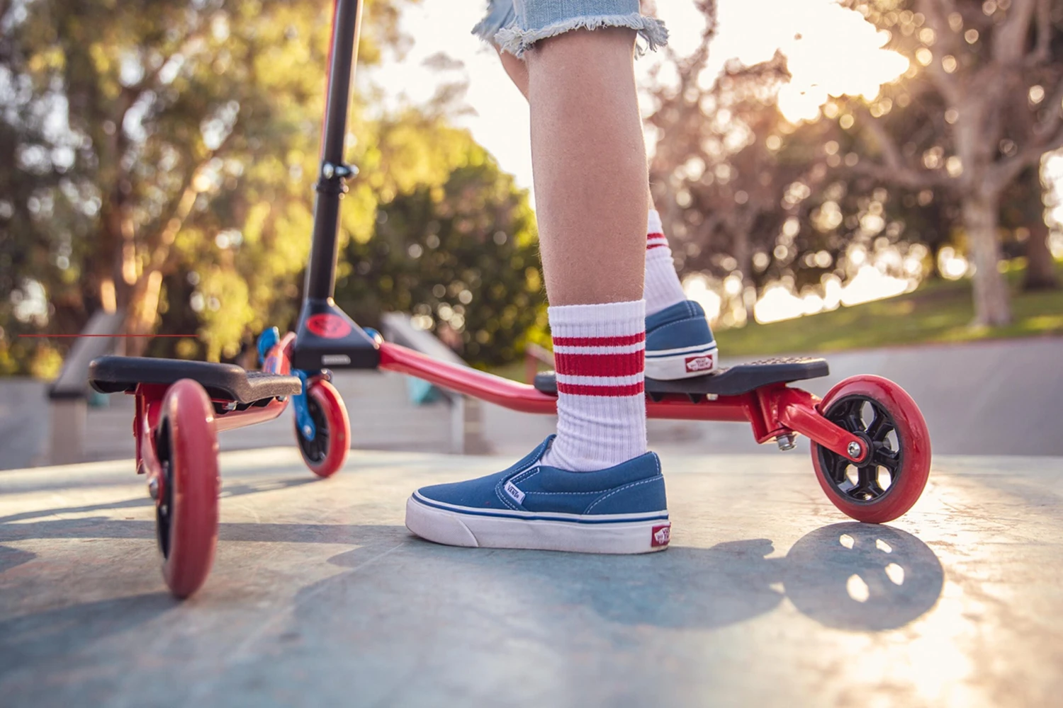 - Unique three-wheel design means no more kicking the pavement